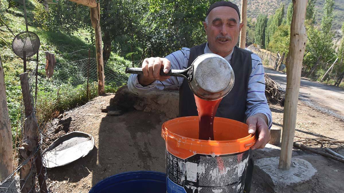Özer, “Bizim köyün bulunduğu bölge üzüm bağlarının bol olduğu bir yerdir. Dedemizden, babamızdan öğrendiğimiz bu yöntemle her yıl pekmez üretiyoruz. Pekmezin iki hammaddesi olan üzüm ve maya toprağı bu köyde bulunuyor. Bizler her yıl bu dönemde yamaçlarda oluşan bağlardaki üzümleri toplayarak köye getiriyoruz. Burada yaptığımız havuzlarda çizmelerle çiğneyerek suyunu çıkarıp posasını ayırıyoruz.