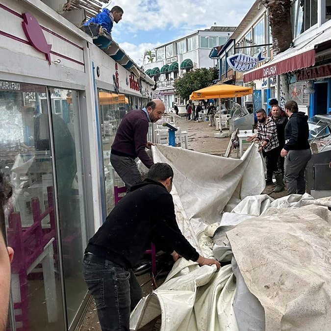 Bodrum’da dün akşam saatlerinden itibaren aralıklarla yağan sağanak, gün içerisinde etkisini arttırdı. İlçede sağanak ve fırtına etkili olurken, kısa süreli dolu yağdı. Gümüşlük’te yaşamı olumsuz etkileyen fırtına nedeniyle bazı iş yerlerinin tente ve çatıları uçtu. Öte yandan, fırtına anı bir vatandaş tarafından cep telefonu kamerasıyla görüntülendi.