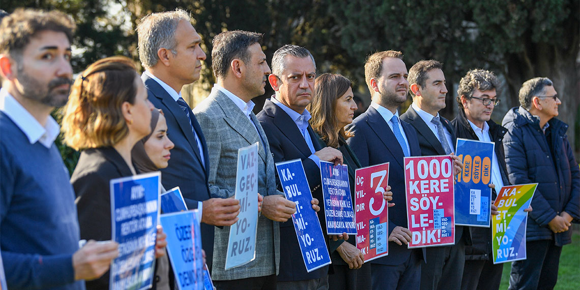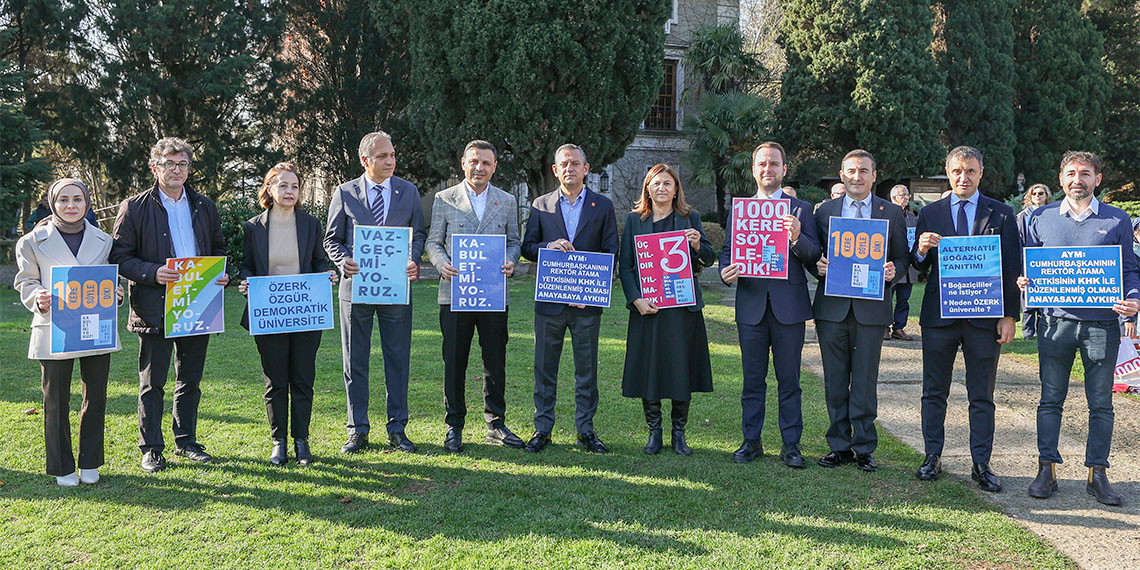 “Ayrıca son birkaç not 200 kişilik emekli akademisyen ve mezunun kampüslere girişi engellenmektedir. Bu yüzden açıklamayı burada yapıyorum. Ben Ana Muhalefet Partisi’nin lideri olarak bu açıklamayı kurumun içinde yapabilirim, işgalcinin kapısında yapabilirim. Her yerde yapabilirim. Ama mezunların, öğrencilerin olmadığı bir yerde yapmamak için burada yapıyorum. Mezunlarıyla, buradan ayrılmış akademisyenleriyle birlikte. Üniversitenin üst yönetim kademeleri kurum dışından atanan kadrolarca ele geçirilmiş durumda. Yukarıda görev almayı bu rektör kimi teklif ederse, bu kayyum kime teklif ederse kabul etmiyor. Kabul edenler de zaten onunla tarihteki aynı yerdeki yerini alıyor. Bu yüzden dışarıya, buraya olmadık yandaşları atıyorlar. Bakın o kafa ne yaptı; Boğaziçi Üniversitesi Arşiv ve Dokümantasyon Merkezi’ni lağvedip lojman yaptı kendisine. Arşiv ve Dokümantasyon Merkezi’ni lağvediyor, oraya lojman yapıyorlar. Boğaziçi Mezunlar Derneği’nin 30 yıllık binasına el koydular, polis zoruyla mezunlar oradan çıkardılar. Geçen hafta Profesör Doktor Ceyhun Ergin’in paylaşımından öğrendik ki, Boğaziçi’nde tadilat nedeniyle kaloriferler yanmıyor. Hocalar, öğrenciler paltoyla ders veriyorlar, ders alıyorlar. Hepimizin gözbebeği Boğaziçi’ni bu hale getirenler, gözümüzün içine bakarak bu yaptıklarını savunamazlar.”