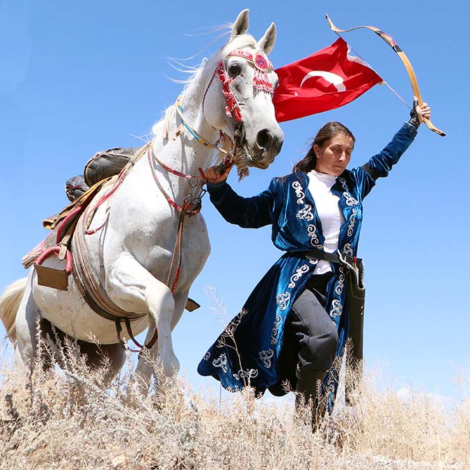 Erzurum’da sınıf öğretmeni ve aynı zamanda Kızıl Elma Geleneksel Sporlar ve Atıcılık Kulüp Başkanı Ayşe Melek Okuyucu (41), turnuvalara katıldığı Boksör adlı beyaz atına gelin olarak bindi.