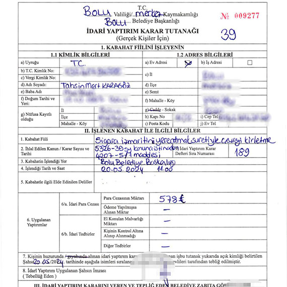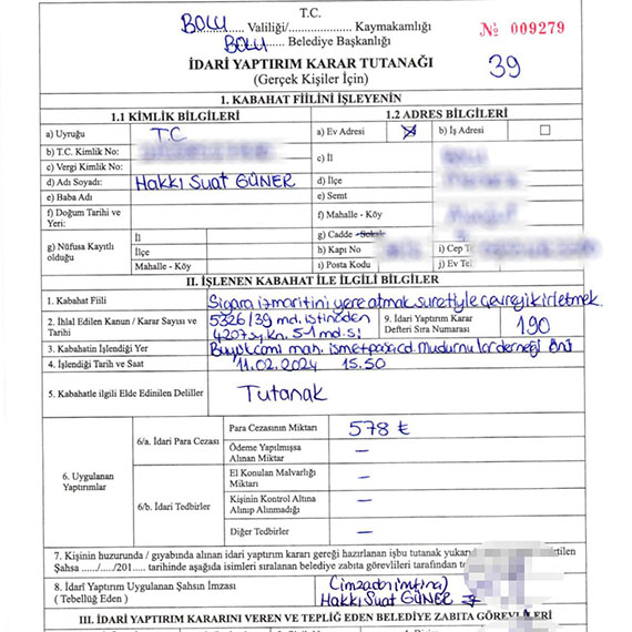 Bolu Belediyesi Zabıta Müdürlüğü ekipleri, AK Parti Bolu İl Başkanı Suat Güner’in bir derneğin açılışı sonrası, CHP Bolu İl Başkanı Tahsin Mert Karagöz’ün de Bolu Belediyesi binası önünde içtikleri sigaraların izmaritini yere attığını tespit etti. İki başkana da ‘Tütün ürünlerinin zararlarının önlenmesi ve kontrolü’ hakkındaki kanunda yer alan ‘Tütün ürünleriyle ilgili izmarit, paket, ağızlık, kağıt ve benzeri atıkların çevreye atılmaması’ maddesi gereği 578’er TL idari para cezası uygulandı. Güner ve Karagöz’e zabıta ekipleri tarafından cezaları tebliğ edildi.
