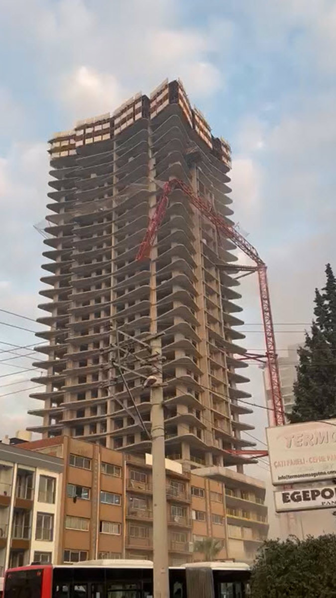 İzmir’in Bornova ilçesinde inşaatı süren bir gökdelene ait vinç, yapıya doğru devrildi. Vinçten kopan parçalar şantiyedeki konteynerlerin üzerine düştü. İhbar üzerine bölgeye çok sayıda itfaiye, polis ve sağlık ekibi sevk edildi. Olayda ölü ve yaralıların olduğu belirtiliyor.