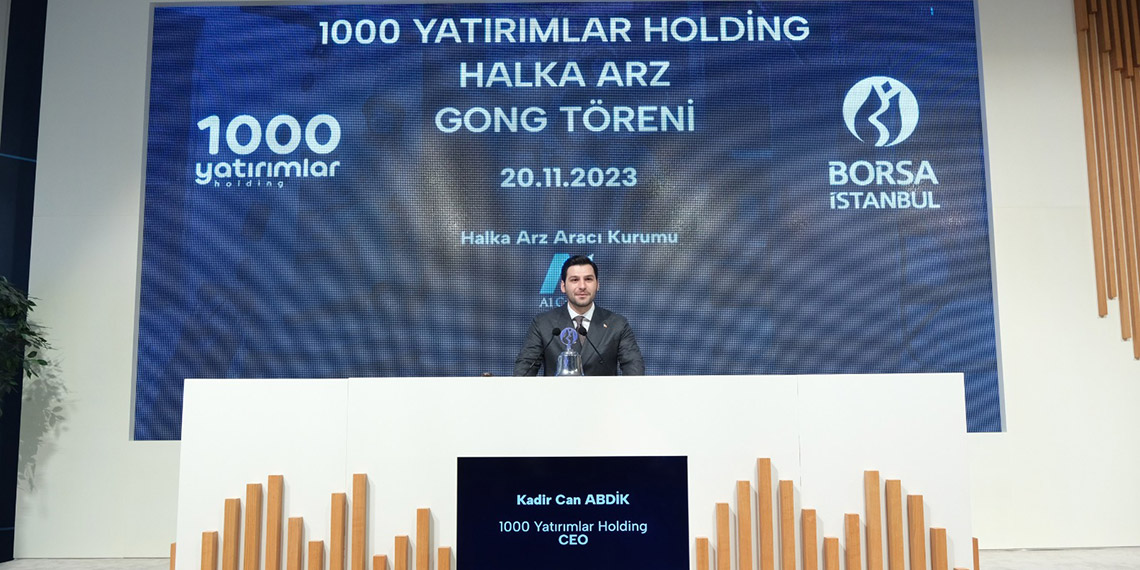 1000 Yatırımlar Holding A.Ş.’nin gong töreni, Borsa İstanbul A.Ş. Genel Müdürü Korkmaz Ergun, 1000 Yatırımlar Holding A.Ş. Yönetim Kurulu Üyeleri, A1 Capital Yatırım Menkul Değerler A.Ş. yöneticileri ve çok sayıda davetlinin katılımıyla 20 Kasım 2023 Pazartesi günü Borsa İstanbul’da gerçekleştirildi.