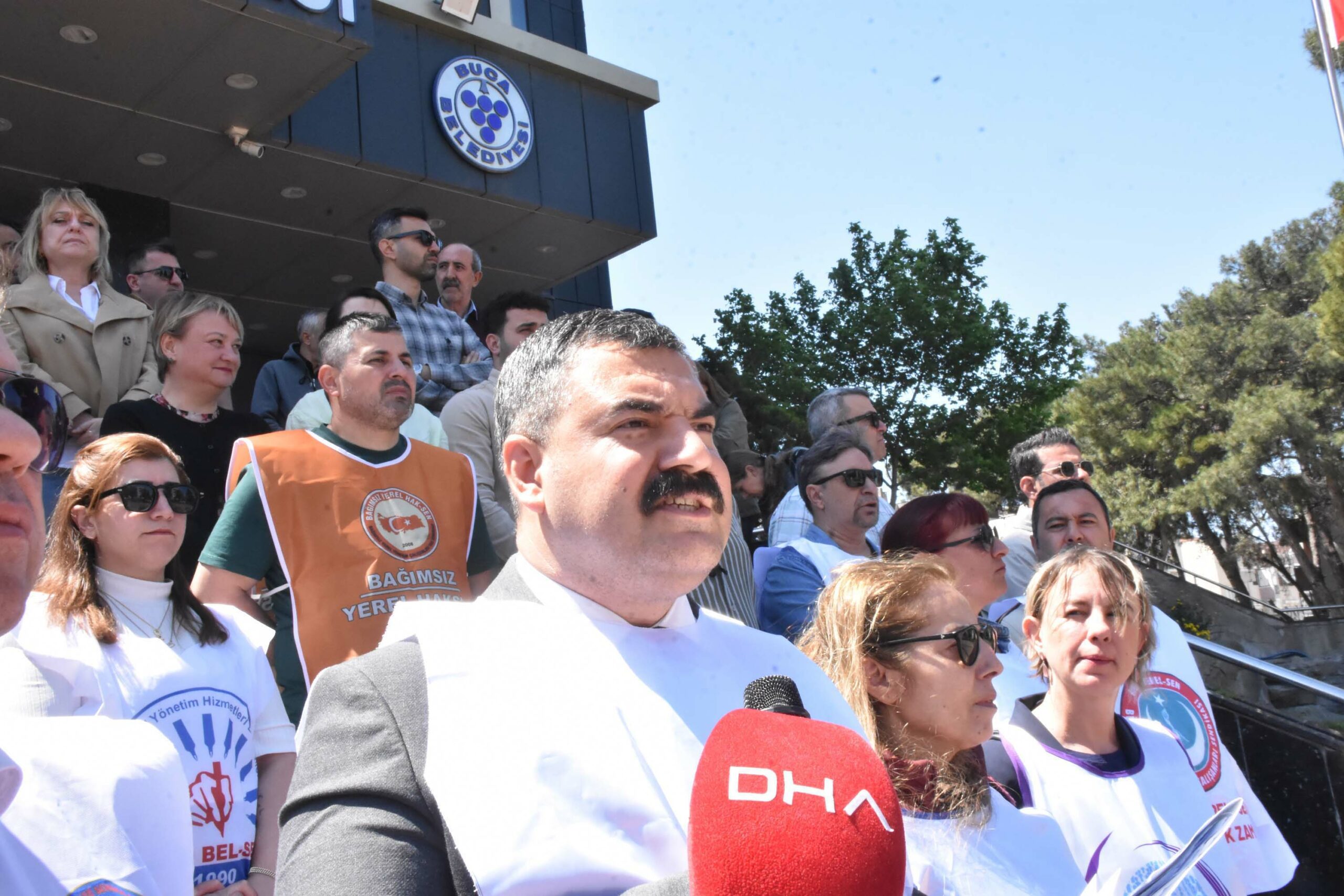 Birlik Yerel-Sen Genel Başkanı Reşat Bozat da belediye binası önünde yaptığı açıklamada, tüm belediye başkanlarına seslenerek, “Sayın belediye başkanı kaçak dövüşmeyi bırakın masaya gelin. Dün Cumhuriyet Halk Partisi İzmir İl Başkanı Sayın Güç ile yaptığımız görüşmede aldığımız yanıt, mazeret üretme sanatının son örneğidir. Belediye başkanlarının hukuki sorumluluk zırhına bürünerek toplu sözleşmeden kaçtıkları ifade edilmiştir. Buradan Buca, Karşıyaka, Bayraklı ve Narlıdere belediye başkanlarına soruyoruz.