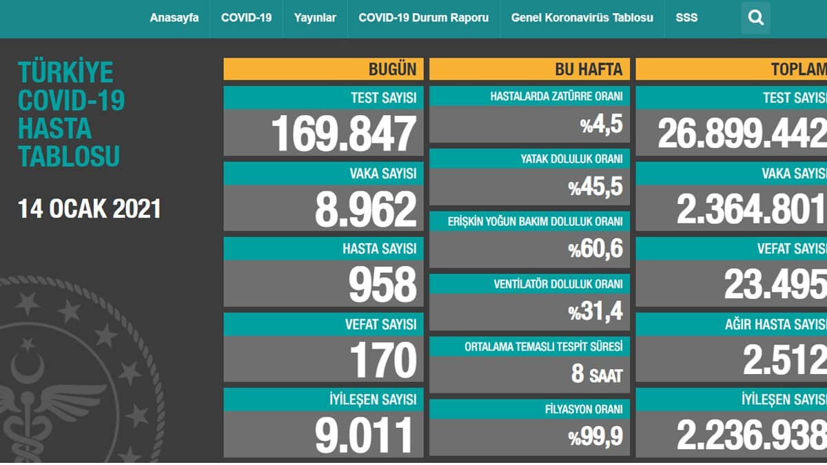 Türkiye Covid- 19 Hasta Tablosu verileri, Sağlık Bakanlığın ilgili sitesinde paylaşıldı. Tabloya göre son 24 saatte yapılan 169 bin 847 testte, 8 bin 962 vaka ile 958 koronavirüs hastası tespit edildi. Bugün yaşamını yitiren 170 kişi ile toplam can kaybı 23 bin 495’e yükseldi.