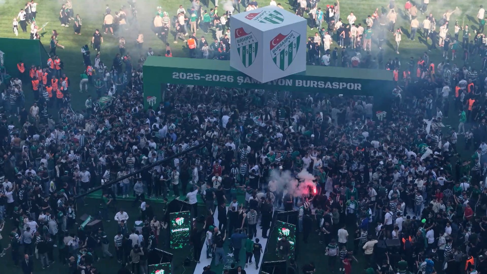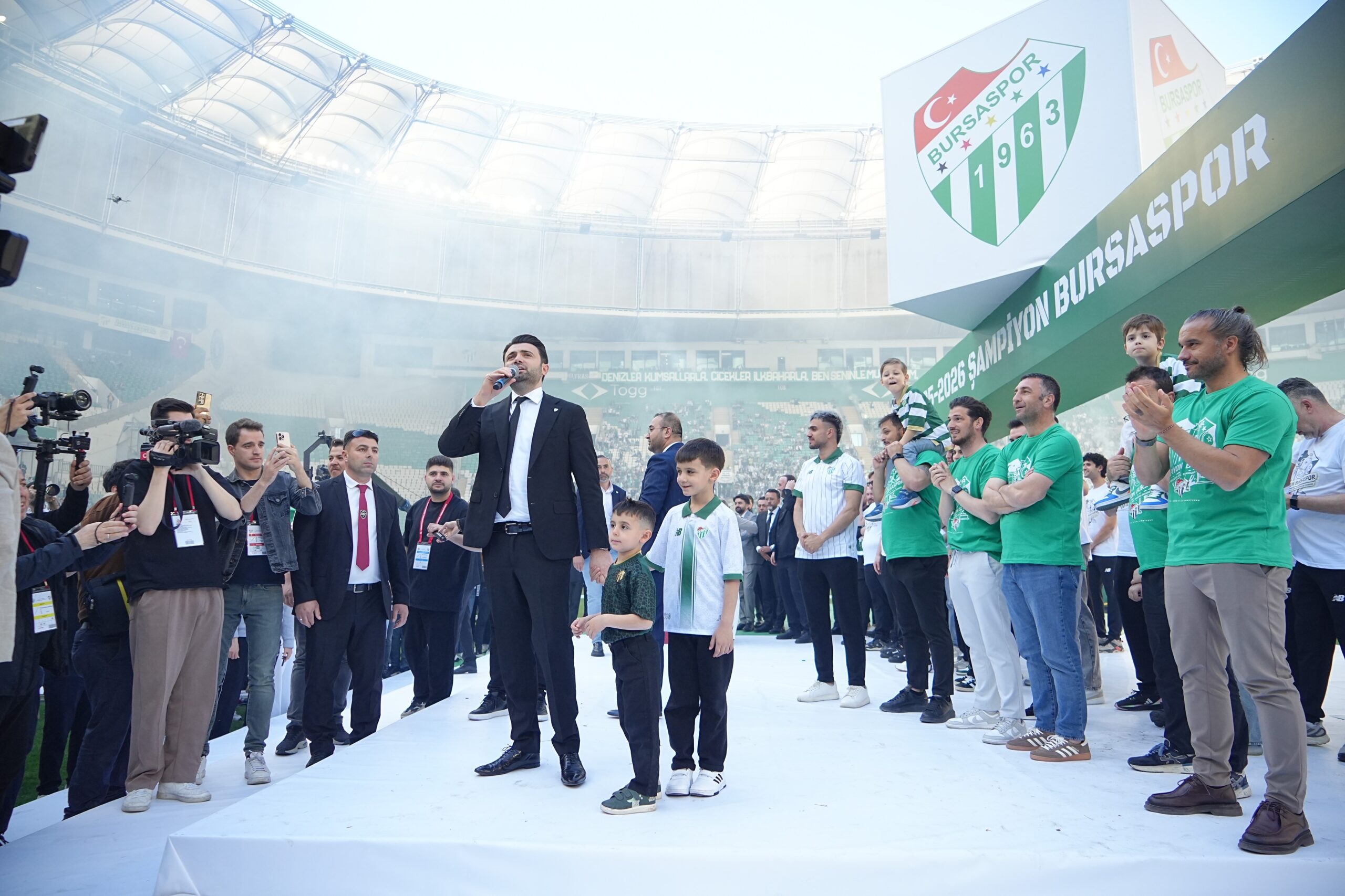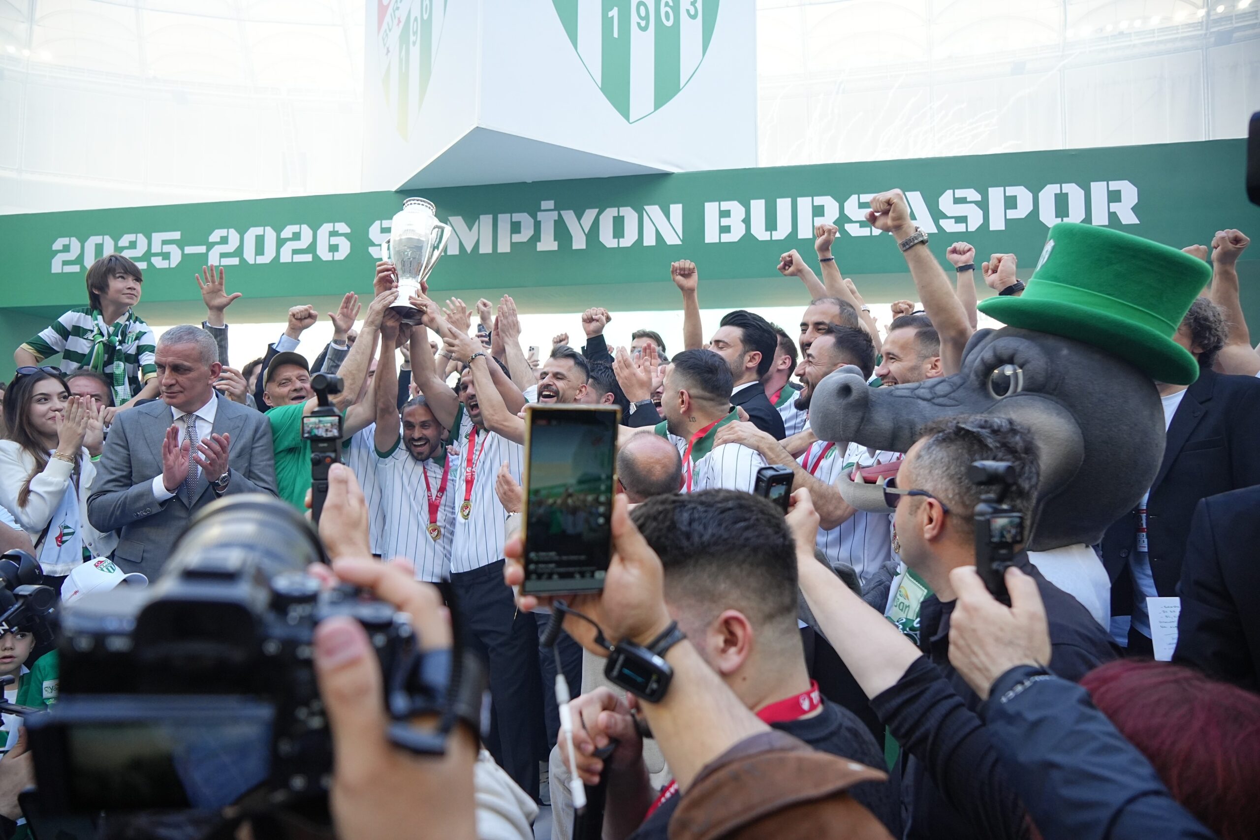 2’nci Lig Kırmızı Grup’ta şampiyon olarak 1’inci Lig’e yükselen Bursaspor’un şampiyonluğu Timsah Arena’da düzenlenen törenle kutlandı. Kutlamalara yeşil-beyazlı taraftarların yanı sıra Bursa Valisi Erol Ayyıldız, İl Emniyet Müdürü Kadir Gökce, Bursa Büyükşehir Belediye Başkan Vekili Şahin Biba, ilçe belediye başkanları ile Ak Parti İl Başkanı Davut Gürkan, milletvekilleri, siyasi parti ve iş dünyası temsilcileri de katıldı. Statta toplanarak, meşale ve havai fişek gösterileriyle şampiyonluğu coşkuyla kutlayan taraftarlar, futbolcular sahneye çağrıldığı sırada tribünlerden yeşil sahaya atladı. Tribün liderlerinin uyarısıyla taraftarlar yerlerine geçerken, Türkiye Futbol Federasyonu Başkanı İbrahim Hacıosmanoğlu’nun konuşmasının ardından verilen şampiyonluk kupası, Bursaspor Başkanı Enes Çelilk, yeşil-beyazlı takımın kaptanı Muhammed Demir ve Teksas Amigosu Selim Kurtulan tarafından kaldırıldı.