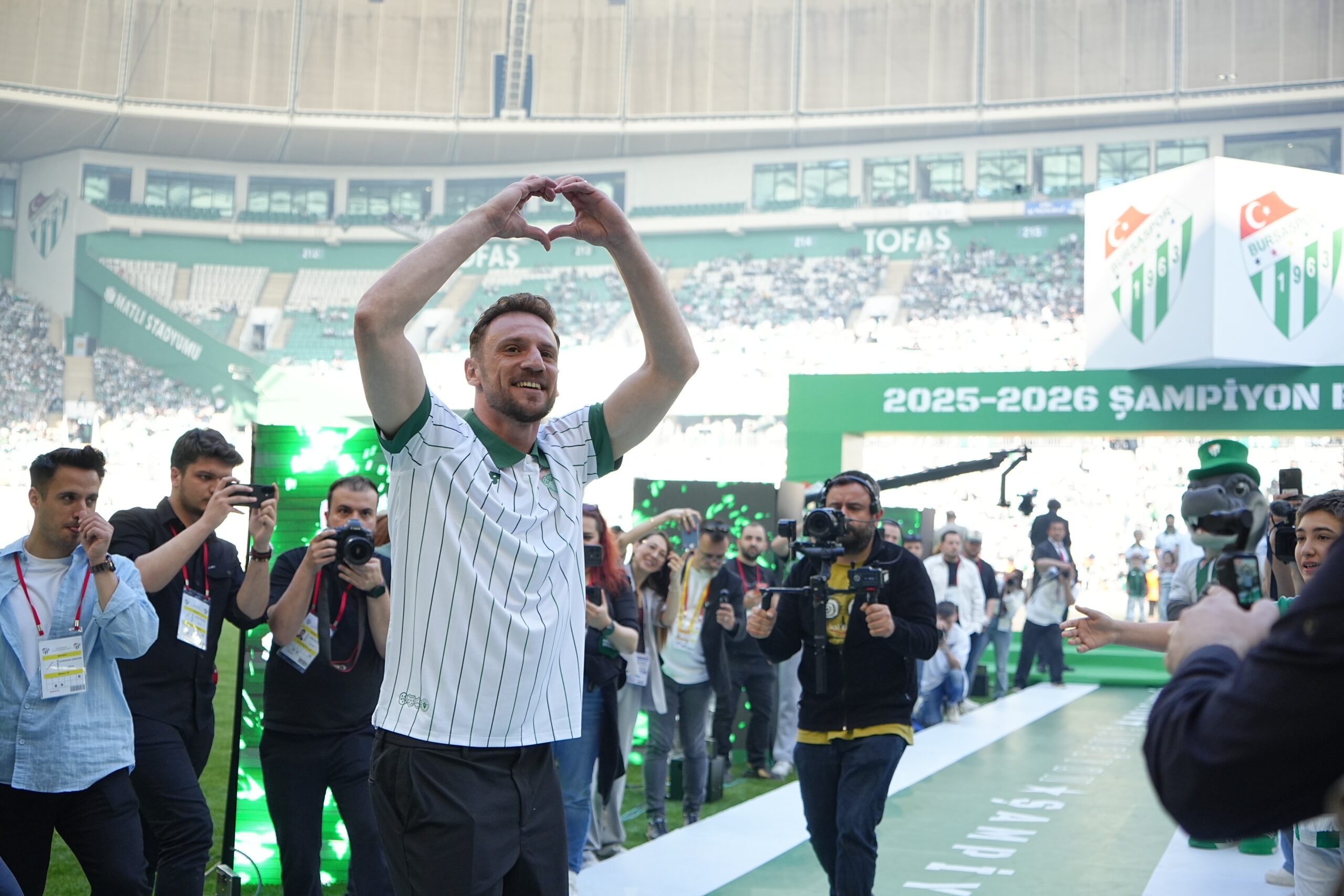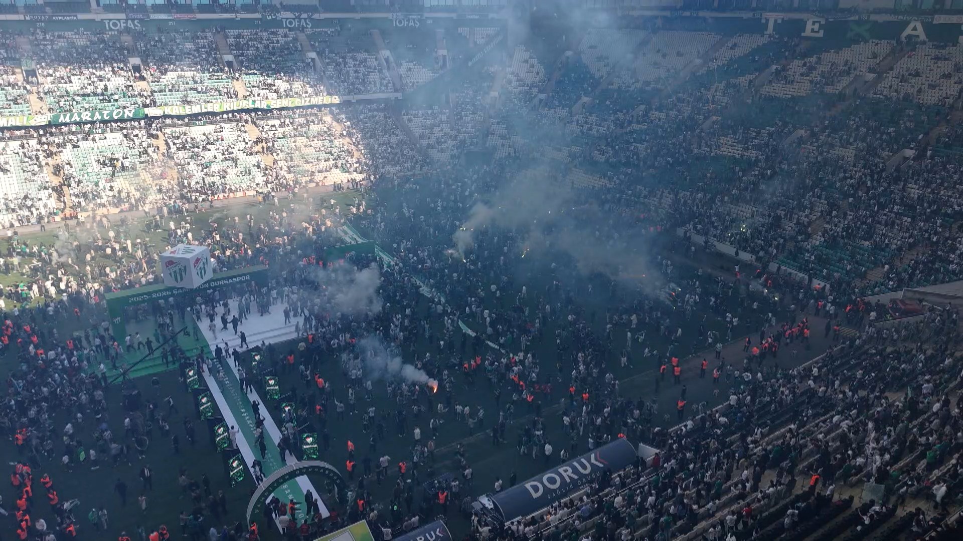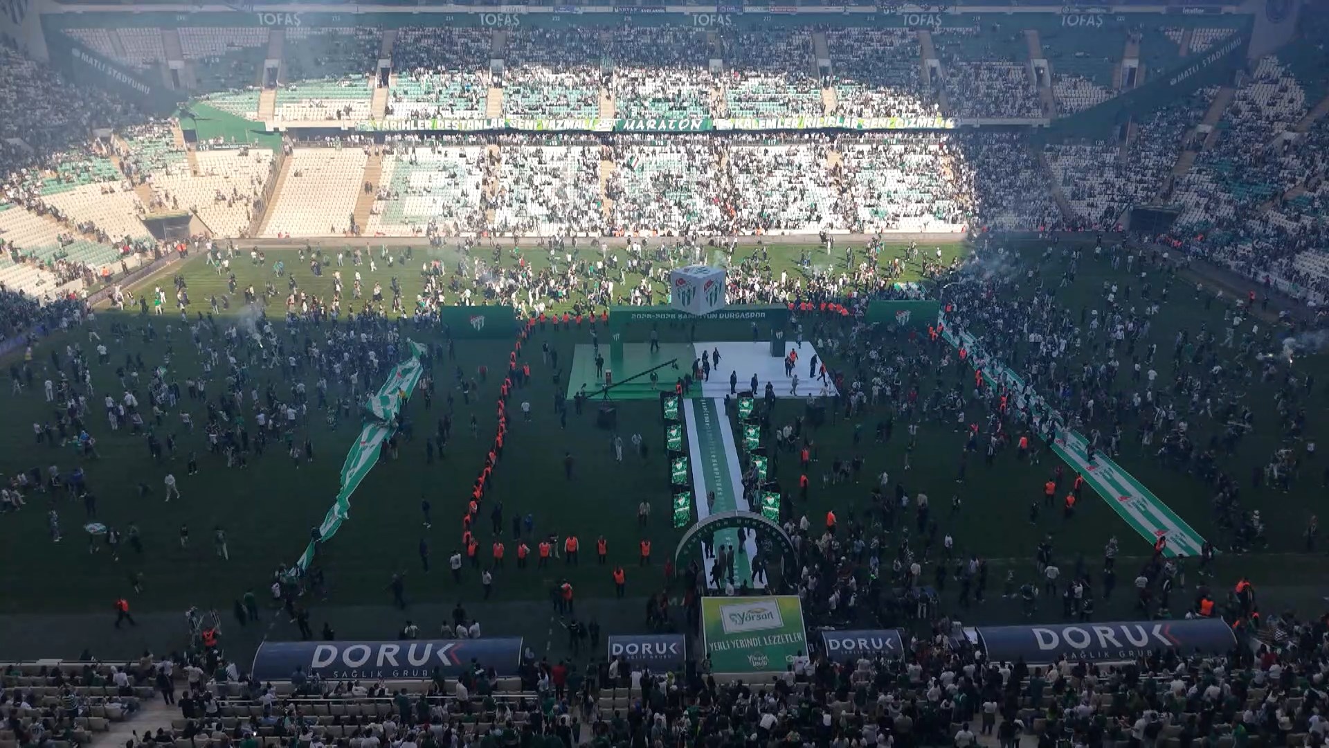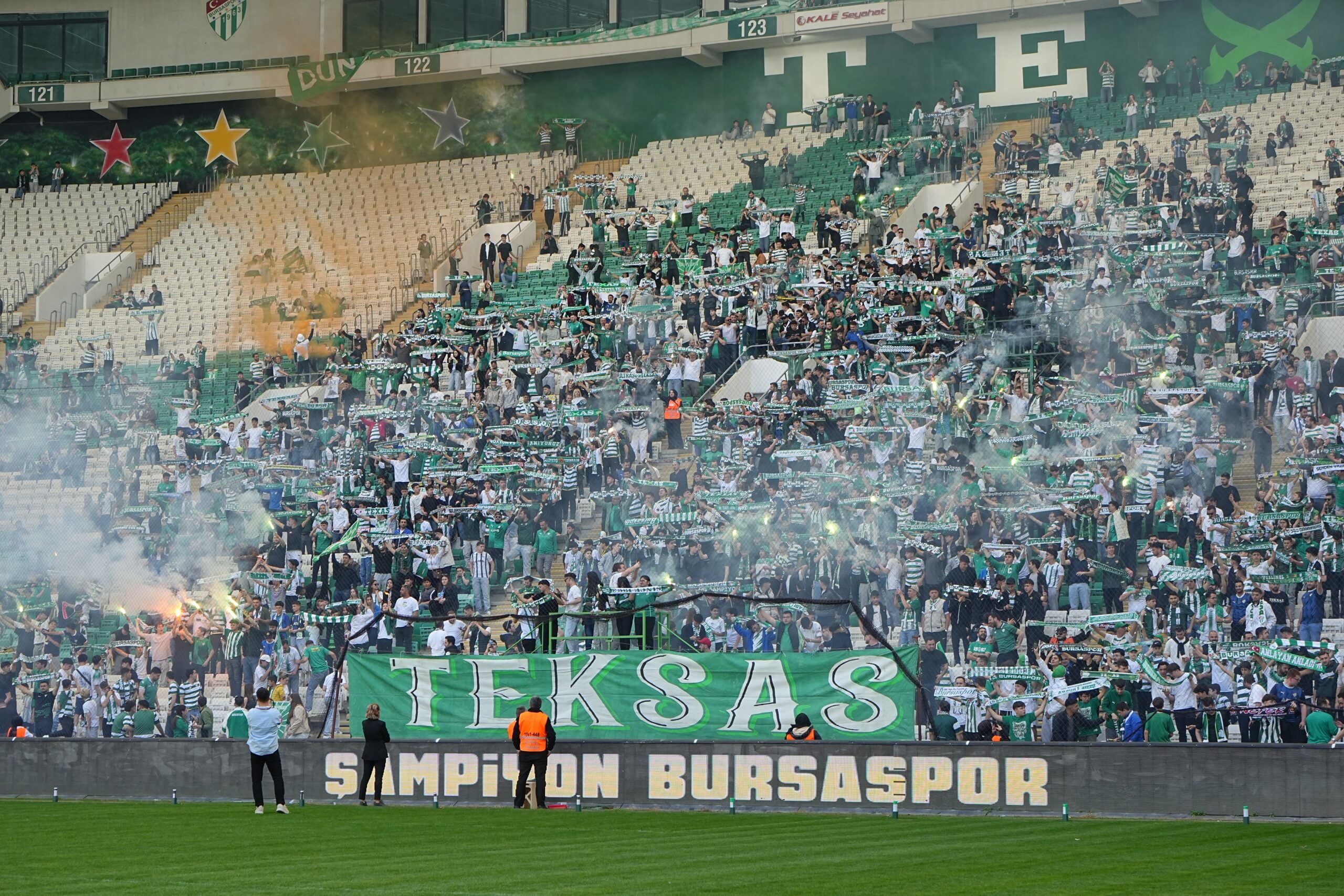 2’nci Lig Kırmızı Grup’ta şampiyon olarak 1’inci Lig’e yükselen Bursaspor’un şampiyonluğu Timsah Arena’da düzenlenen törenle kutlandı. Kutlamalara yeşil-beyazlı taraftarların yanı sıra Bursa Valisi Erol Ayyıldız, İl Emniyet Müdürü Kadir Gökce, Bursa Büyükşehir Belediye Başkan Vekili Şahin Biba, ilçe belediye başkanları ile Ak Parti İl Başkanı Davut Gürkan, milletvekilleri, siyasi parti ve iş dünyası temsilcileri de katıldı. Statta toplanarak, meşale ve havai fişek gösterileriyle şampiyonluğu coşkuyla kutlayan taraftarlar, futbolcular sahneye çağrıldığı sırada tribünlerden yeşil sahaya atladı. Tribün liderlerinin uyarısıyla taraftarlar yerlerine geçerken, Türkiye Futbol Federasyonu Başkanı İbrahim Hacıosmanoğlu’nun konuşmasının ardından verilen şampiyonluk kupası, Bursaspor Başkanı Enes Çelilk, yeşil-beyazlı takımın kaptanı Muhammed Demir ve Teksas Amigosu Selim Kurtulan tarafından kaldırıldı.