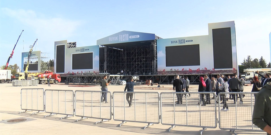 Atatürk Havalimanı’nda 28 Ekim Cumartesi günü yapılacak olan Filistin Mitingi öncesinde hazırlıklar sürüyor. Ak Parti Genel Başkan Yardımcısı Hamza Dağ ve Mustafa Şen ile Ak Parti İl Osman Nuri Kabaktepe, havalimanında hazırlık çalışmalarını inceledi. Miting alanında dev platformun kurulum çalışmaları devam ederken, alanın belirli noktalarına demir bariyerler getirildi. Ses sistemlerinin de kurulduğu görüldü.