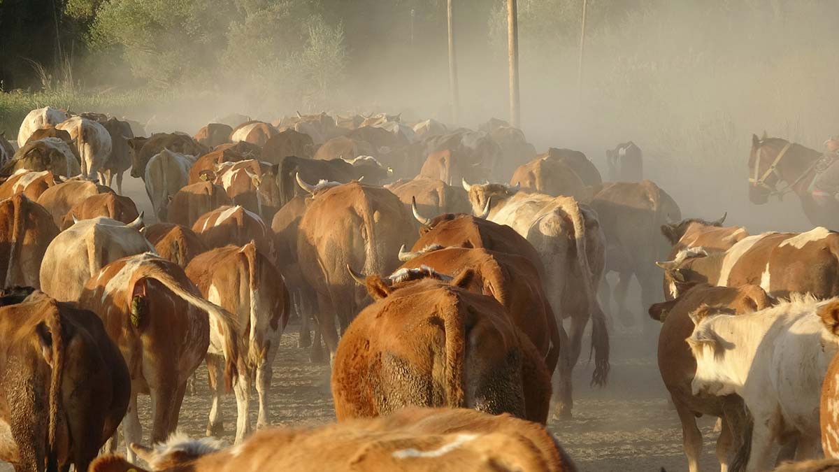Erciş ilçesine 10 kilometre uzaklıkta bulunan Van Gölü kıyısındaki Kasımbağı Mahallesi’nde 350 hayvandan oluşan büyükbaş sürüsünün mera yolculuğu dron ile görüntülendi. Çobanların eşliğinde tozu dumana katarak ilerleyen sürü, 10 kilometre mesafe katederek meraya ulaşıyor. Merada karınlarını doyuran hayvanlar, akşam geri getiriliyor.