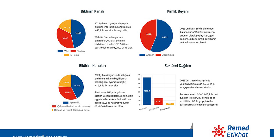 2023 yılının ilk yarısında gerçekleşen bildirimlerde en çok kullanılan iletişim kanalı yüzde 46,9 ile web sitesi oldu. Web sitesi üzerinden yapılan bildirimleri, yüzde 35,5 ile telefon bildirimleri takip ederken; üçüncü sırayı yüzde 17,6 ile e-posta bildirimleri yer alıyor. Bu yılın ilk yarısında yüzde 43,8’i kimliklerini açık bir şekilde paylaşırken, geri kalan yüzde 56,2’lik kesim ise kimlik bilgilerinin anonim kalmasını tercih ediyor.