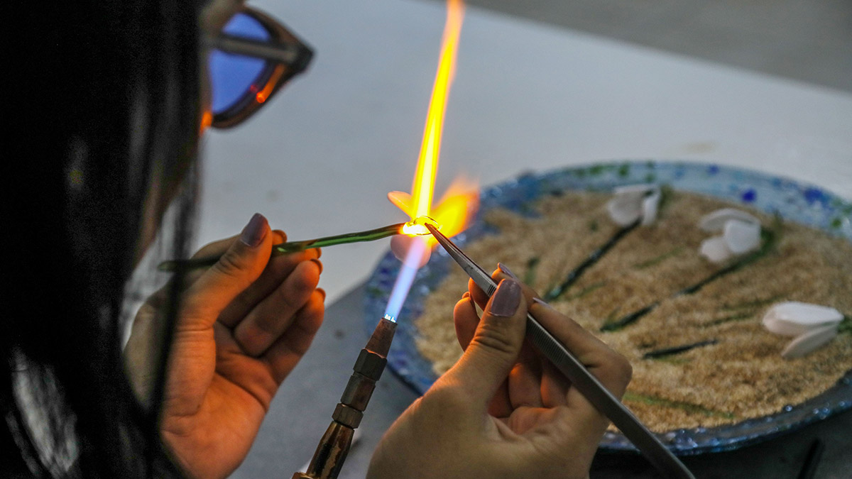 Bir cama şekil verebilmek için onu ısıtarak yumuşatmak gerektiğini belirten Esra Bozoğlan, “Yapacağım çiçeğin hangi bölümü ise ona göre şekli önceden tasarlıyorum. Çiçekleri açık alevle şekillendirme tekniği ‘Şaloma’ kullanıyorum.