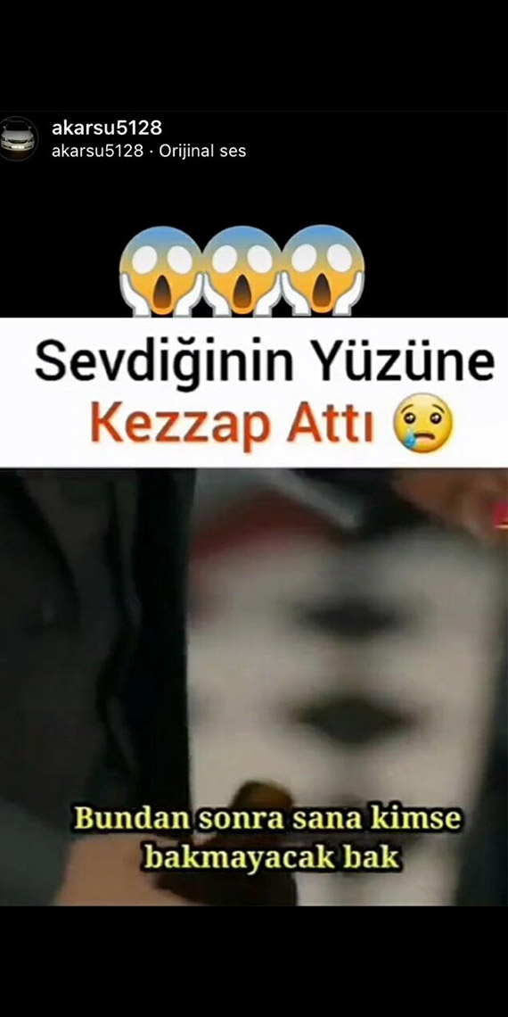 Çanakale’de bir masaj salonunda çalışan Buket Arıyel’in (24) yüzüne kezzap atarak yaralayan Ramazan A.’nın (41) 3 Aralık’ta sosyal medya hesabından ‘Sevdiğinin yüzüne kezzap attı’ başlığıyla video paylaştığı ortaya çıktı. Bir dizinin bölümü olduğu öğrenilen videoda; bir erkeğin, kadının yüzüne şişedeki sıvıyı attığı görülüyor.