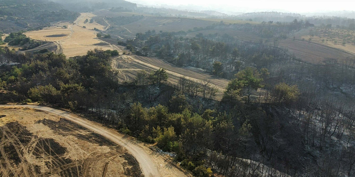 Yangına müdahalenin devam ettiği kentte, söndürme çalışmalarının tamamlandığı bazı noktalardaki ağaçlar küle döndü. Soğutma çalışmalarının devam ettiği bölgelerde yangının ardından yüzlerce ağacın yanmasıyla bölgenin yeşil rengi griye döndüğü görüldü. Bu bölgelerde ise helikopter ve uçaklarla soğutma çalışmaları sürüyor.