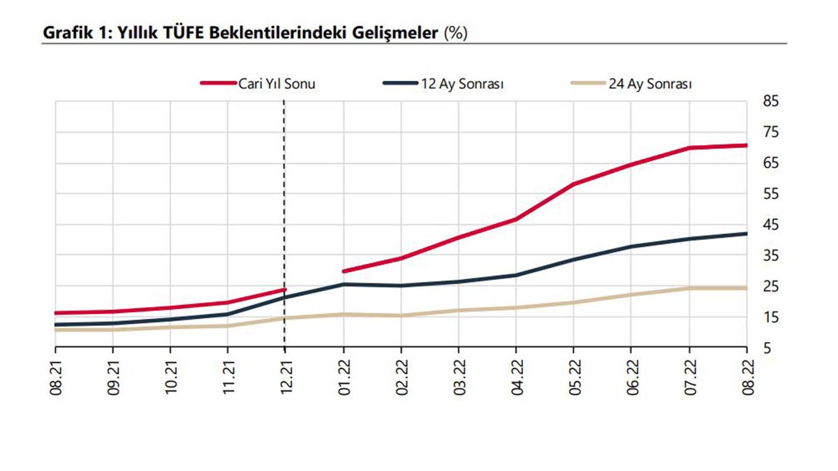 TCMB’den yapılan açıklamaya göre, katılımcıların cari yıl sonu TÜFE beklentisi, önceki anket döneminde yüzde 69,94 iken bu anket döneminde yüzde 70,60 oldu. 12 ay sonrası TÜFE beklentisi, yüzde 40,23’ten yüzde 41,99’a çıktı. 24 ay sonrası TÜFE beklentisi ise yüzde 24,27 iken yüzde 24,35 olarak değişti.