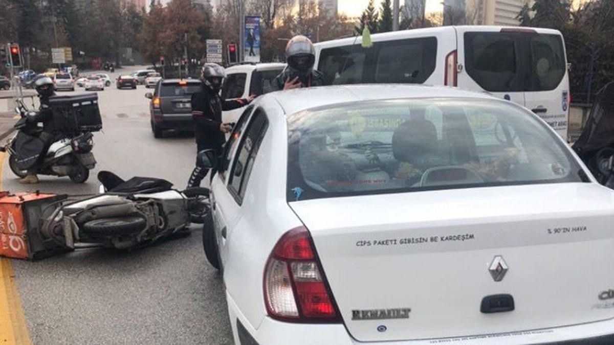 Kaza öğle saatlerinde Çankaya ilçesi Aşkabat Caddesinde meydana geldi. Kimliği belirlenemeyen sürücü, 06 Z 0910 plakalı otomobiliyle, aynı yönde giden motosiklete arkadan çarpıp, üzerindeki kuryenin düşmesine neden oldu. Kazada yaralanan olmazken, otomobil sürücüsü yola devam etmek istedi. Ancak kurye ve arkadan motosikletiyle gelip kaza yerinde duran arkadaşı, otomobilin önüne geçerek sürücüye engel olmaya çalıştı.