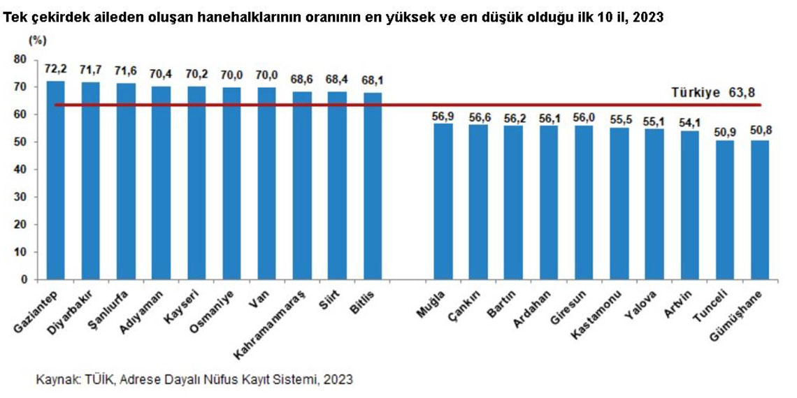Türkiye’de ortalama hanehalkı büyüklüğü yıllar içerisinde azalma göstererek 2008 yılındaki 4 kişi seviyesinden 2023’te 3,14 kişiye geriledi. Çekirdek ailelerin, toplam hanehakları arasındaki oranı yıllar içerisinde azalarak yüzde 63,8’e gerilerken; tek kişilik hane halkları ile çekirdek aile bağı bulunmayan birden fazla kişiden oluşan hanehalklarının oranları arttı.
