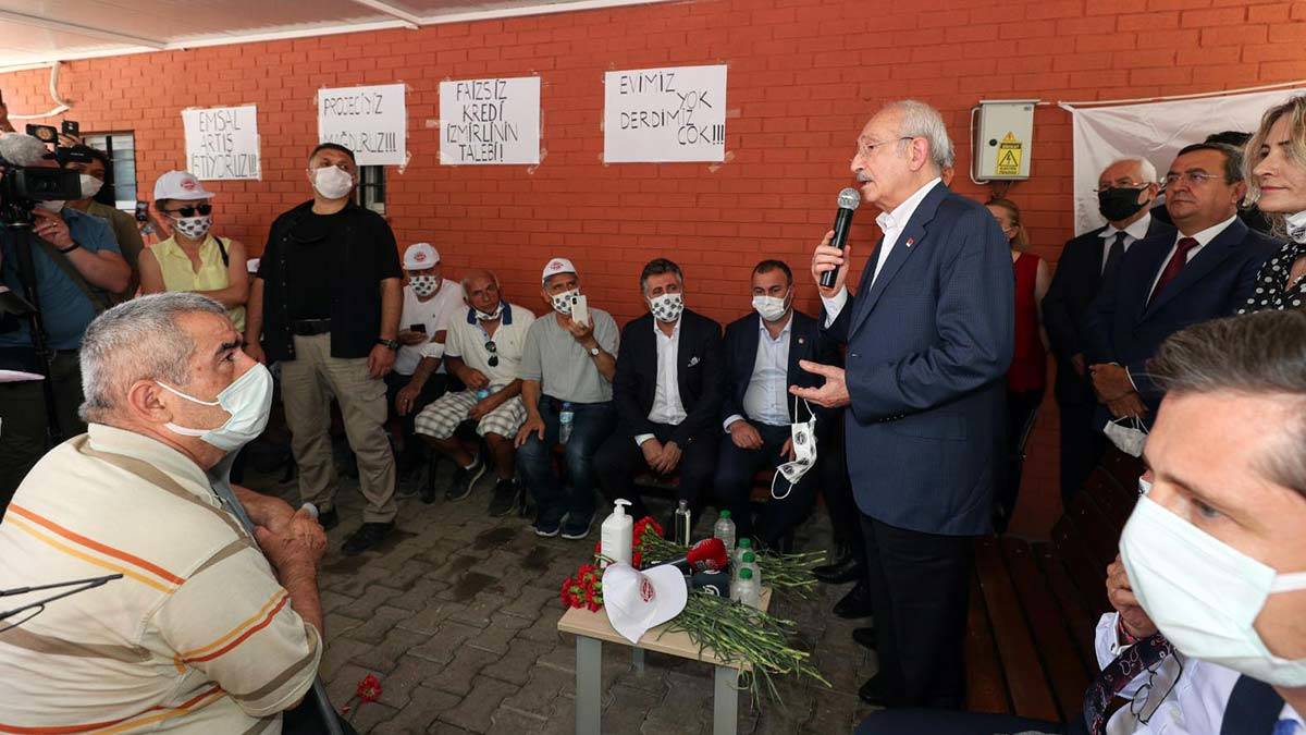 CHP Genel Başkanı Kemal Kılıçdaroğlu, İzmir Büyükşehir Belediyesi’nin hayata geçirdiği yatırımların açılış törenlerine katılmak üzere geldiği İzmir’de 30 Ekim depreminin mağdurlarıyla da buluştu. İzmir Depremzedeleri Dayanışma Derneğini ziyaret eden Kılıçdaroğlu, İzmir Büyükşehir Belediyesi’nin depremde yıkılan konutların yeniden yapılması için bulduğu uygun koşullu Dünya Bankası kredisinin 2 aydır Cumhurbaşkanı’nın onayını beklediğini söyledi. İzmir Depremzedeleri Dayanışma Derneğini ziyaret eden Kılıçdaroğlu, “Acılı günlerde beraber olup, birbirimizin acılarını paylaşmak son derece önemli. Depremden hemen sonra buraya geldik, sizlerle birlikte olduk. Bugün yine birlikteyiz” dedi.