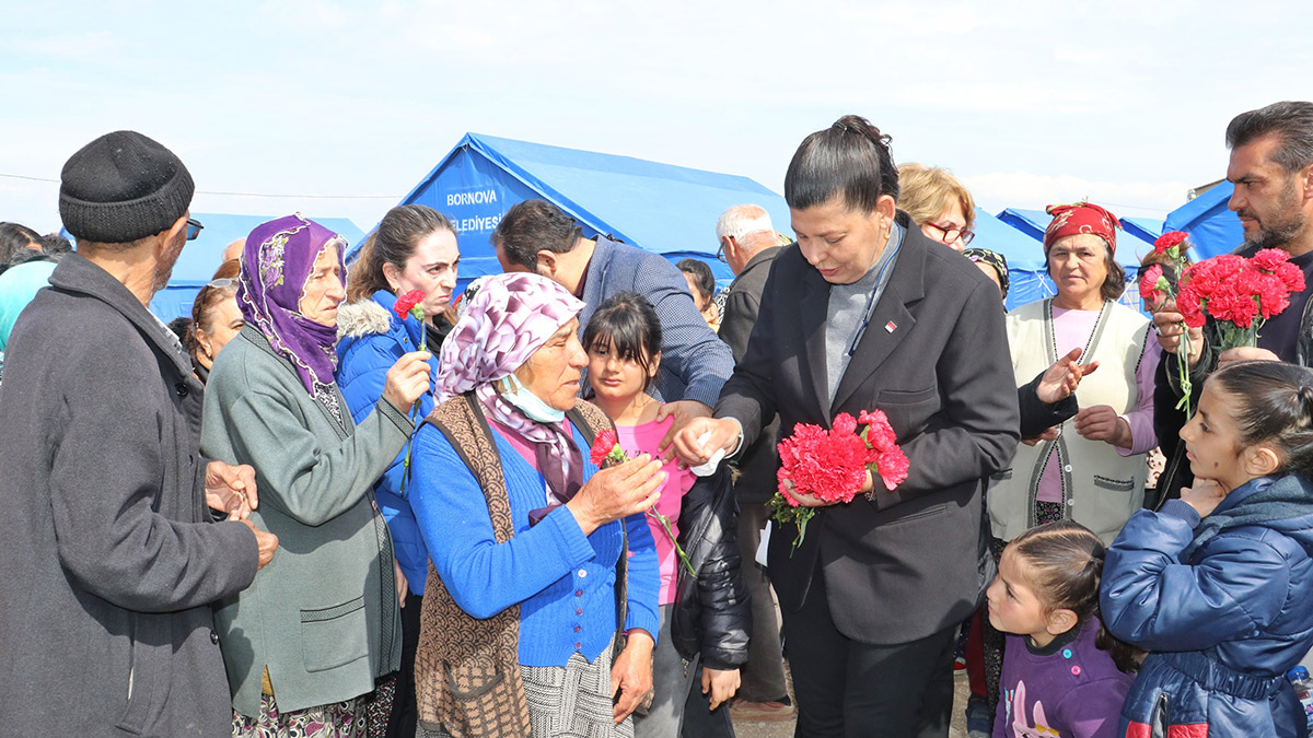 Depremzede kadınlara karanfiller dağıtan CHP İl Kadın Kolları Başkanı Nezahat Aydın, deprem felaketi nedeniyle bu yıl 8 Mart’ı buruk kutladıklarını belirterek, “Bu sene 8 Mart’ta içimizde hem bir burukluk hem de büyük bir umut var. Üzgünüz çünkü ‘Sesimi duyan var mı ‘ diye seslenirken enkaz altında yaşamını kaybeden canların yüreğimizde acısı var” dedi.