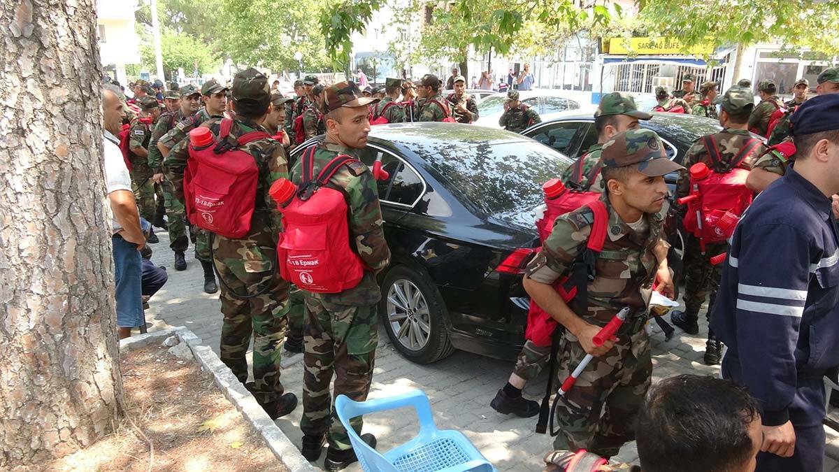 Aydın’ın Çine ilçesinde devam eden orman yangınlarını söndürme çalışmalarına, Azerbaycan’dan destek geldi. 200 asker, Çine’nin kırsal Akçaova Mahallesi’ndeki yangın söndürme çalışmalarına katıldı. Otobüslerle bölgeye gelen Azerbaycan askerlerini gören köylüler ise duygusal anlar yaşadı.