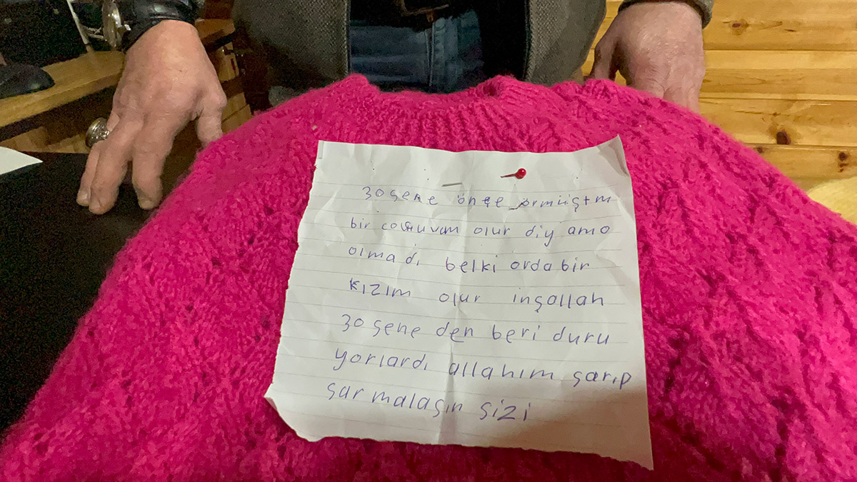Bartın’da, depremzedelere gönderilmek üzere muhtarlığa bırakılan çocuk kıyafetlerinin olduğu poşetten çıkan, ’30 sene önce örmüştüm bir çocuğum olur, diye ama olmadı. Belki orada bir kızım olur inşallah. 30 seneden beri duruyorlardı, Allah’ım sarıp sarmalasın sizi’ yazılı not, duygulandırdı.