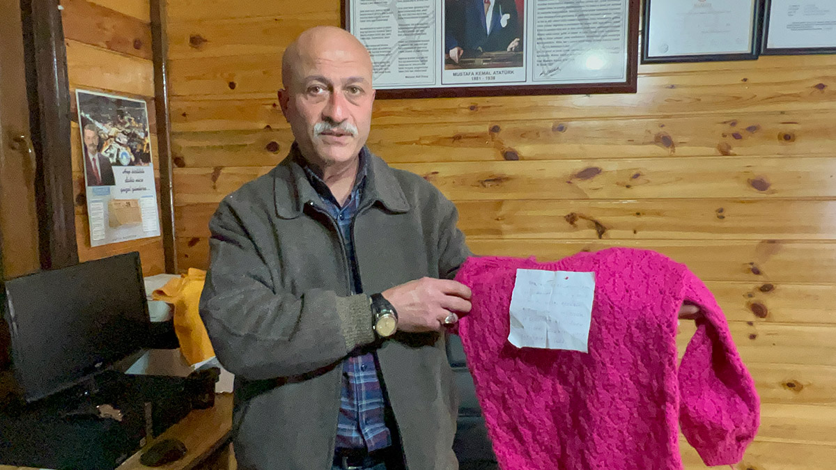 Esentepe Mahallesi’nin muhtarı Şenol Özdemir, “Depremzedeler için yardımlar topluyorduk. Çok kalabalık vardı. O sırada bu poşeti biri getirmiş. Poşetleri açarken, üzerinde bir not olan kıyafet gördüm. İçinde değişik renklerde el işi örülmüş kıyafet vardı. Yazıyı okuduğumda çok duygulandım. Allah ondan razı olsun, inşallah Rabb’im ona da çocuk nasip eder. Bunu bırakan kardeşimiz bunları 30 yıl önce örmüş ve saklamış. Kendisini de tanımıyorum, tanısam elini öpeceğim” dedi.