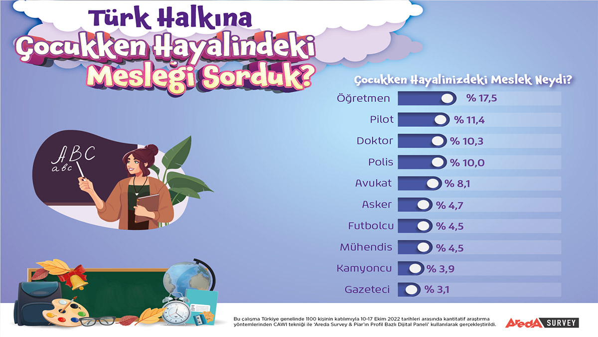 Areda Survey’in 1100 kişinin katılımıyla gerçekleştirdiği ‘Çocuklukta hayal edilen meslekler’ araştırmasına göre, Türk halkının yüzde 17,5’i çocukluğundaki meslek hayalinin öğretmenlik olduğunu belirtti.