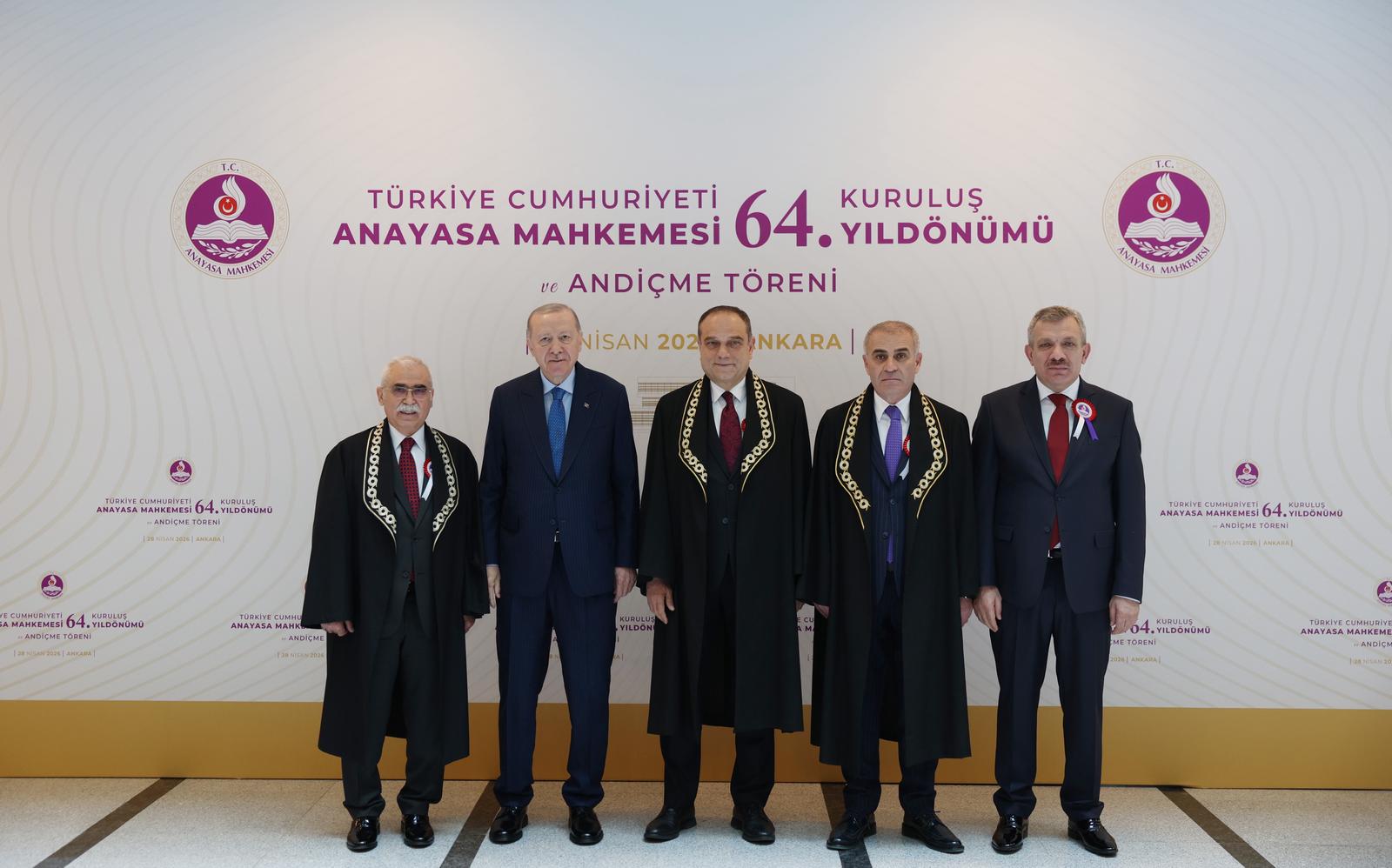 AYM'nin 64'üncü kuruluş yıl dönümü nedeniyle düzenlenen '64'üncü Kuruluş Yıl Dönümü ve Anayasa Mahkemesi Üyeliğine Seçilen Şaban Kazdal'ın Andiçme Töreni', AYM Yüce Divan Salonu'nda gerçekleştirildi. Törene Cumhurbaşkanı Recep Tayyip Erdoğan, TBMM Başkanı Numan Kurtulmuş, Adalet Bakanı Akın Gürlek, AYM Başkanı Kadir Özkaya, Ankara Cumhuriyet Başsavcısı Gökhan Karaköse, yüksek yargı mensupları ve davetliler katıldı.