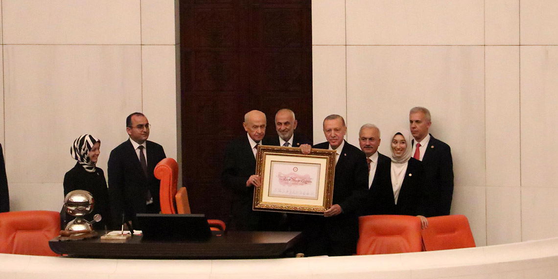 Daha sonra Genel Kurul’da yemin töreni gerçekleşti. Töreni Erdoğan’ın eşi Emine Erdoğan, oğlu Bilal Erdoğan, kızları Sümeyye Erdoğan Bayraktar, Esra Erdoğan Albayrak, Selçuk Bayraktar ve torunları da locadan izledi. Geçici Meclis Başkanı Bahçeli’nin yemin törenini başlatması ile birlikte Erdoğan, Genel Kurul’a davet edildi. Erdoğan, AK Parti ve MHP milletvekilleri tarafından ayakta alkışlandı.