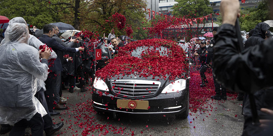 28 Mayıs’ta yapılan 2’nci tur oylamada Cumhurbaşkanı seçilen Erdoğan, Cumhurbaşkanlığı Külliyesi’nden motosikletli polis ekiplerinin konvoyu eşliğinde TBMM’ye hareket etti. Yağmur yağışı altında ilerleyen Erdoğan’ın içinde bulunduğu makam aracına TBMM girişinde vatandaşlar karanfil attı. Erdoğan, TBMM’de Geçici Meclis Başkanı MHP Genel Başkanı Devlet Bahçeli tarafından törenle karşılandı. Yoğun yağmur altındaki karşılama töreninin ardından Erdoğan, Meclis’e geçti.