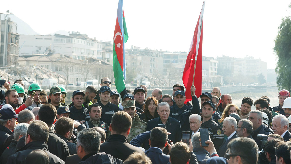 Cumhurbaşkanı Recep Tayyip Erdoğan ve Milliyetçi Hareket Partisi (MHP) Genel Başkanı Devlet Bahçeli, Kahramanmaraş merkezli depremlerin yoğun hasar verdiği Hatay’a bağlı Antakya ilçesindeki Atatürk Caddesi’nde incelemelerde bulundu. Cumhurbaşkanı Erdoğan ve Devlet Bahçeli’ye, İçişleri Bakanı Süleyman Soylu, Milli Savunma Bakanı Hulusi Akar, Sağlık Bakanı Fahrettin Koca, Tarım ve Ormancı Bakanı Vahit Kirişci eşlik etti.