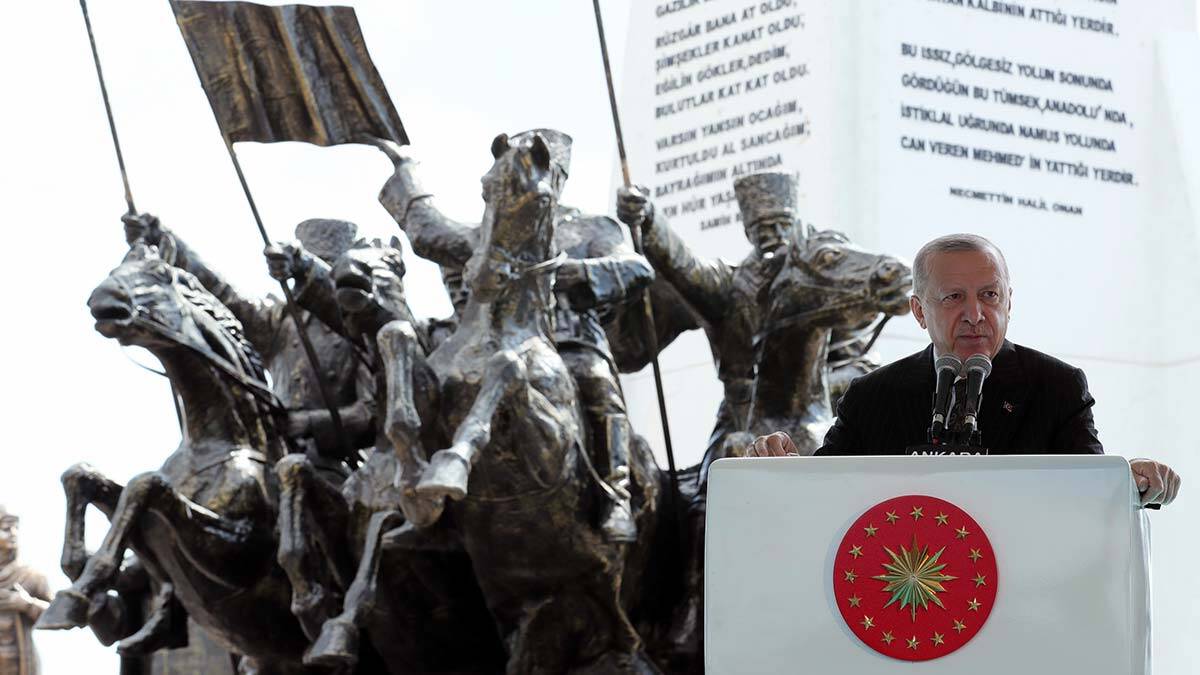 Top seslerinin artık Ulus’tan duyulmaya başlandığı bir süreçte ordunun adeta düşmana ‘dur’ diyerek savaşı istiklal ile sonuçlandırdığını belirten Erdoğan, “Büyük Taarruz‘un müjdesini bu bölgede vermiştir. al Dağı’nda, Beştepe’de, Karlıtepe’de, Duatepe’de, Mangal Dağı’nda, ‘Korkma sönmez bu şafaklarda yüzen al sancak’ diye başlayan İstiklal Marşı’mıza ilham veren kahramanlarımız, Polatlı Haymana hattında verdikleri büyük mücadele ile isimlerini tarihe; cesaretleri ve kanlarıyla kazımışlardır. ‘Hattı müdafaa yoktur, sathı müdafaa vardır. O satıh bütün vatandır’ anlayışıyla yürütülen bu savaşta vatanın her karışını kanlarının son damlasına kadar koruma kararıyla cephede yerini alan askerlerimiz, zafer kesinleşene kadar aynı azimle mücadele etmiştir” diye konuştu.