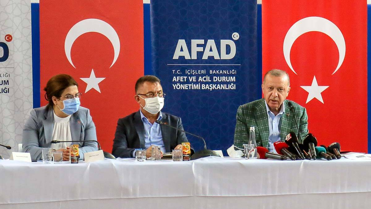 Cumhurbaşkanı Erdoğan buradaki genel değerlendirme toplantısının ardından açıklamada bulundu. Bölgede yaşanan afet sebebiyle tüm afetzedelere geçmiş olsun dileklerini ilettiğini belirten Erdoğan, “Bugün sabah itibarıyla orman yangınlarından etkilenen tüm bölgelerimizi Genel Hayata Etkili Afet Bölgesi ilan ettik ve Genel Hayata Etkili Afet Bölgesi ilan etmek suretiyle de vatandaşlarımızın bu beklentilerini devlet olarak gidermiş olduk” dedi.