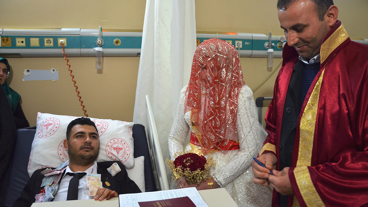 Şanlıurfa’da nikah törenine 2 gün kala geçirdiği trafik kazasında ayaklarında kırıklar oluşan Yusuf Gülel (26), ve Esra Tut (21) çiftinin nikahları hastanede kıyıldı.