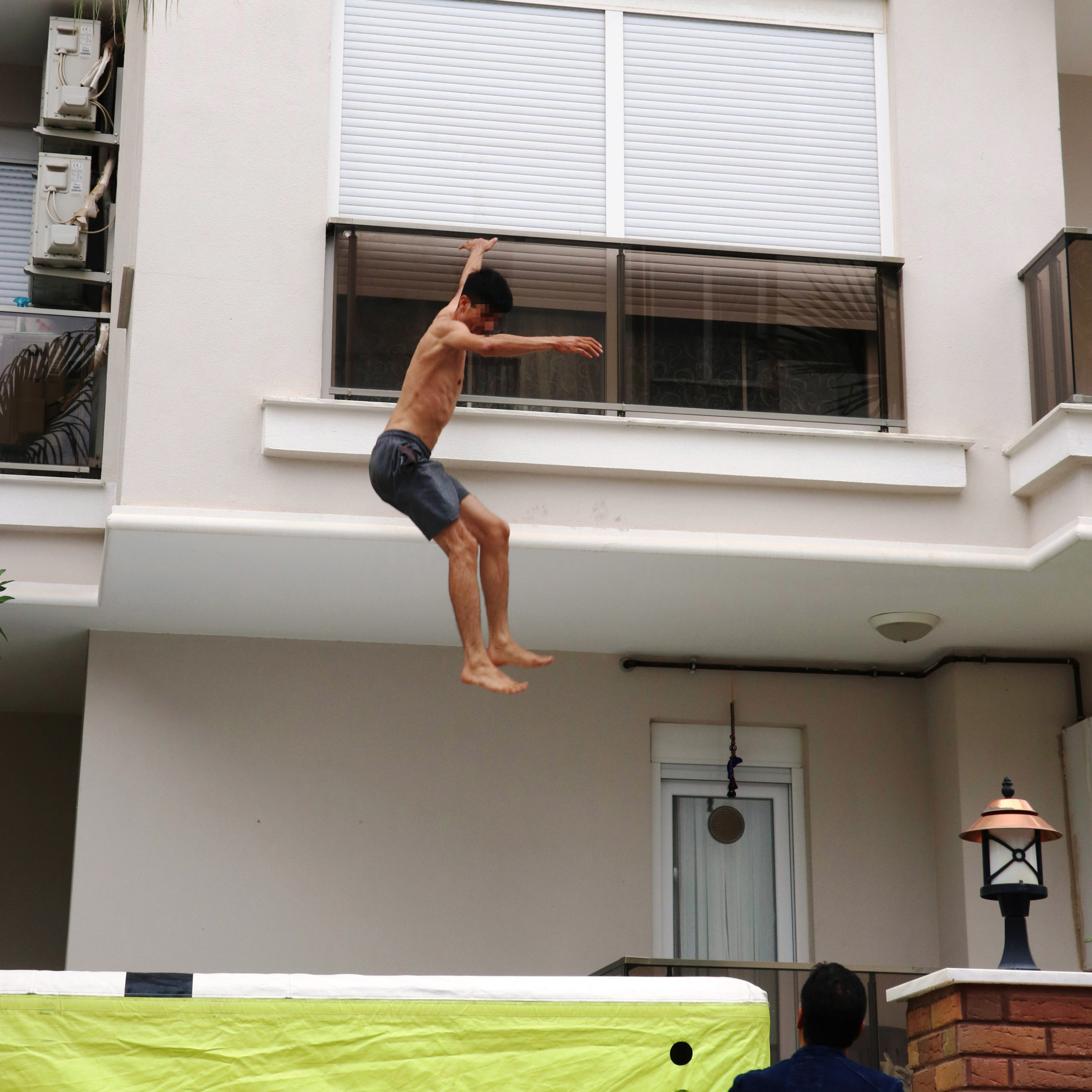 Çağırılan özel harekat polisleri 5 saatin sonunda kapıyı çilingire açtırarak içeri girdi. E.Ç., 2’nci kat balkonundan birinci katın pencere demirlerine bastı. Burada bir süre bekleyen E.Ç., üst kata çıkamayınca kendisini itfaiyenin şişme brandası üzerine bıraktı.