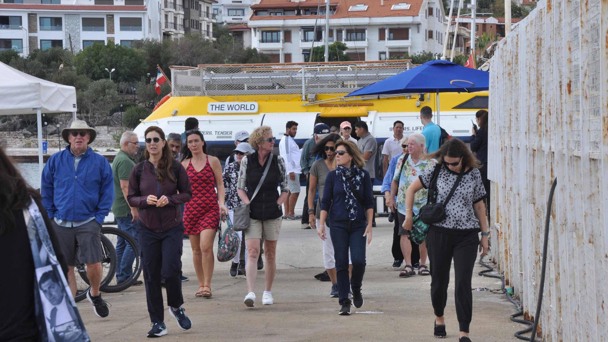 Datça’ya gelen 196 metrelik uzunluğundaki Bahama bayraklı ultra lüks devre mülk kruvaziyer ‘The World’, ilçenin açıklarına demir attı. Gemi yanaşma iskelesi olmadığı için Ulaştırma ve Alt Yapı Bakanlığı’nın özel izni ile yolcular, özel teknelerle karaya taşındı.