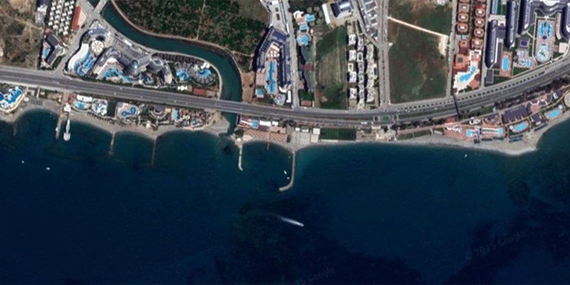 Uydu görüntülerinde boş olan denize, ilerleyen yıllarda denizin yaklaşık 150 metre doldurularak iskele yapıldığı, iskelelere ise şezlong ve locaların yerleştirildiği görüldü.