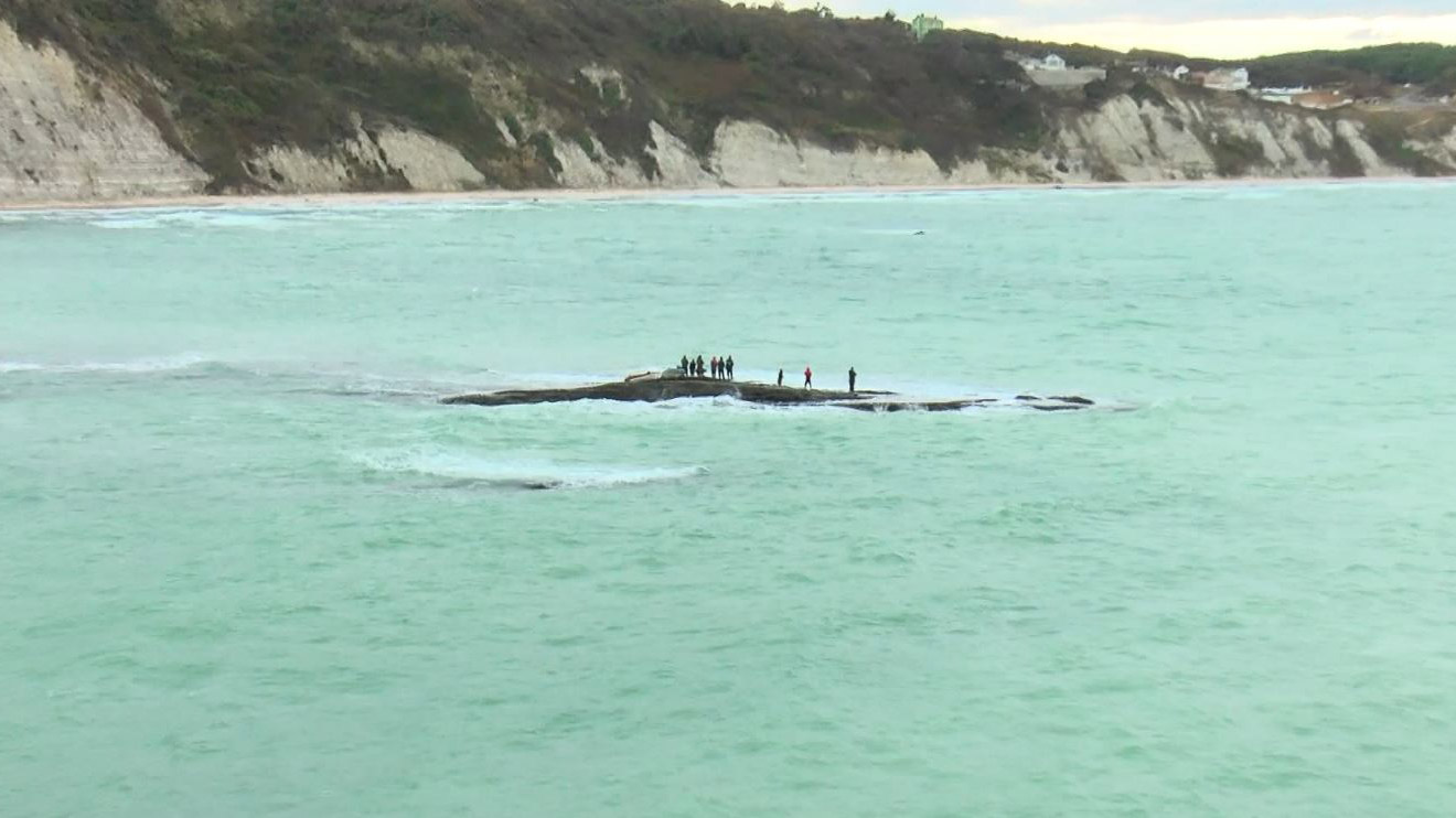 Deniz ortasında tehlikeli balık avı! Arnavutköy Karaburun Sahili’nde, 10 kişi, kötü hava koşullarına aldırış etmeden kayaya çıkıp balık tuttu.