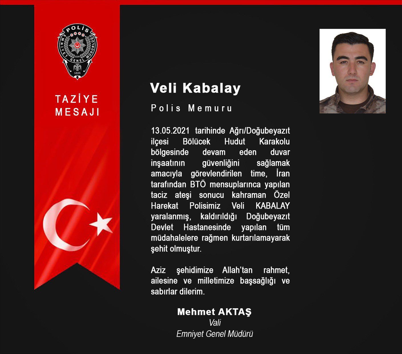 “13 Mayıs 2021 tarihinde Ağrı/Doğubeyazıt ilçesi Bölücek Hudut Karakolu bölgesinde devam eden duvar inşaatının güvenliğini sağlamak amacıyla gönderilen time, İran tarafından bölücü terör örgütü mensuplarınca yapılan taciz ateşi sonucu kahraman Özel Harekat polisimiz Veli Kabalay yaralanmış, kaldırıldığı Doğubeyazıt Devlet Hastanesi’nde yapılan tüm müdahalelere rağmen kurtarılamayarak şehit olmuştur. Aziz şehidimize Allah’tan rahmet, ailesine ve milletimize başsağlığı ve sabırlar dilerim.”
