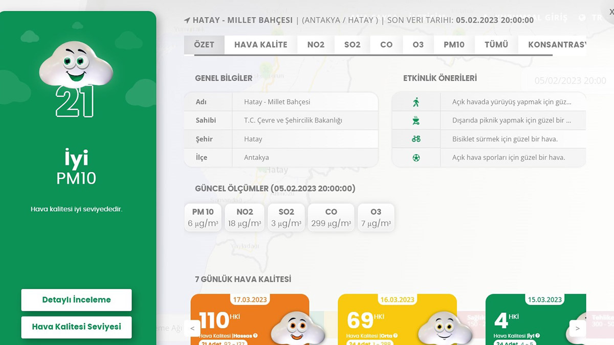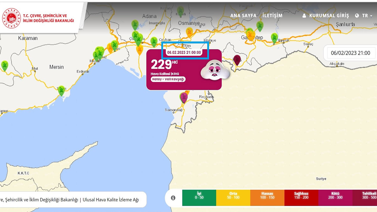 Çevre, Şehircilik ve İklim Değişikliği Bakanlığı Ulusal Hava Kalite İzleme Ağı, Sürekli İzlem Merkezi (SİM) verilerine göre; depremden etkilenen illerin bulunduğu bölgede hava kirliliği depremden hemen önceki gün risksiz düzeydeyken, depremin olduğu gün ve sonraki günler, havadaki toz partiküllerinin de etkisiyle yıkımın en çok yaşandığı illerden Kilis, Hatay gibi merkezlerde tehlikeli düzeylere ulaştı.
