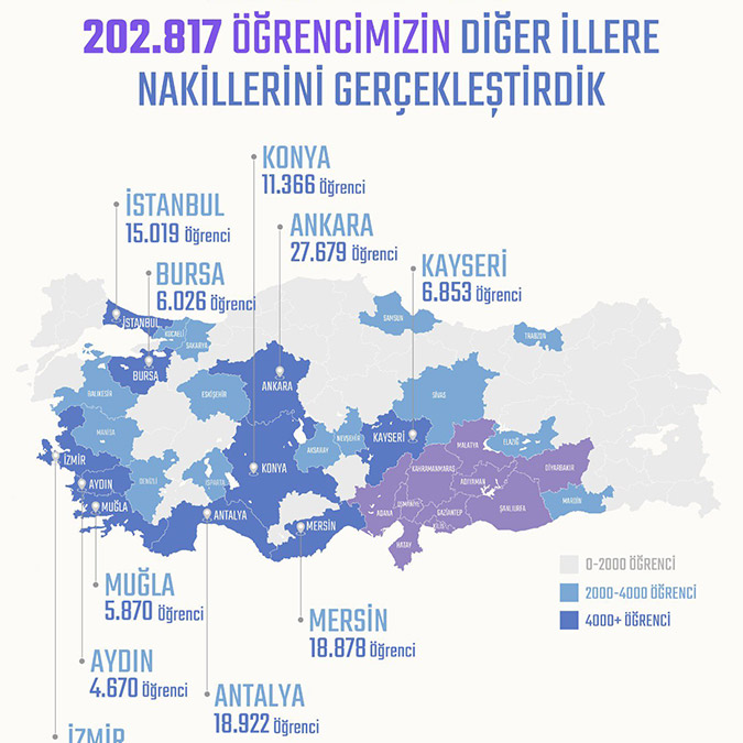 Kahramanmaraş merkezli depremlerde yıkıma uğrayan 10 ilde deprem öncesi toplam 3 milyon 600 bin 891 öğrenci olduğunu belirten Özer, “Deprem sonrasında nakil yaptıran 202 bin 815 öğrencimizden 66 bin 914 öğrenciyle en fazla Hatay’dan diğer illere nakil yapıldığını görüyoruz. Hatay’dan sonra en fazla öğrenci nakli alınan il 50 bin 245 öğrenciyle Kahramanmaraş. Malatya 36 bin 900, Adıyaman 21 bin 629, Gaziantep 13 bin 706, Osmaniye 3 bin 853, Adana 3 bin 635, Diyarbakır 2 bin 808, Şanlıurfa 2 bin 803, Kilis’ten ise 322 öğrenci başka illere nakil yaptırdı” dedi.