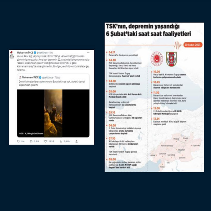 İletişim Başkanlığı tarafından hazırlanan ’19-20 Şubat Dezenformasyon Bülteni’ ile deprem sırasında görülen ışımalar, devletin afetzedelere yaptığı 10 bin TL’lik yardımlara haciz konulduğu, TOKİ’nin Konya’da yaptığı evlerin boş durduğu, depremin ardından askerin sokakta olmadığı, Kızılay’ın yardım kolilerinin açılarak içindeki malzemelerin Suriyeli derneğin kolilerine yerleştirildiği iddialarına cevap verildi.