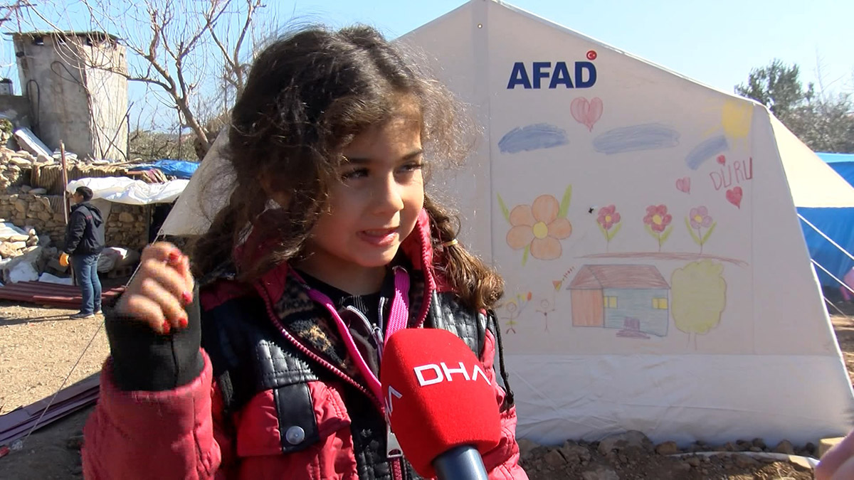 Türkoğlu Başpınar Mahallesi’nde iki katlı evlerinin enkazında anneannesiyle kalan 5 yaşındaki Hüsne Duru, kaldığı çadıra hayallerini çizdi.