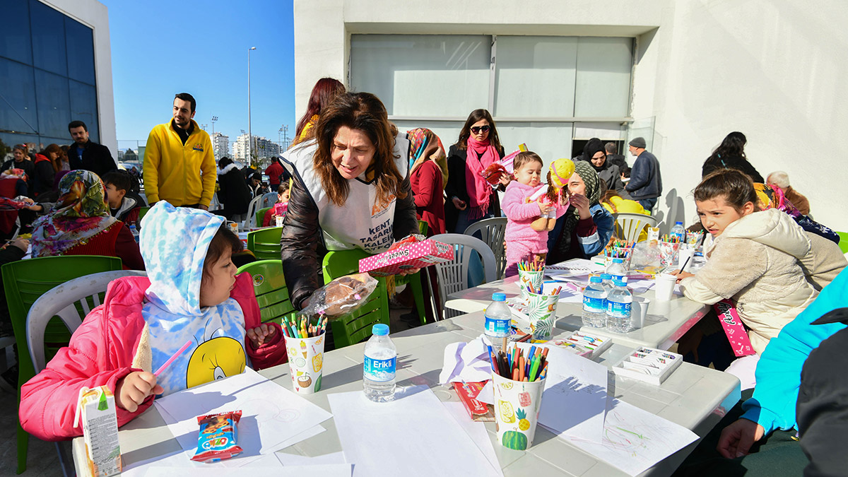 Antalya’ya gelen depremzedelerin ihtiyaçlarının karşılanması için açılan ‘Ücretsiz Mağaza’da çocuklar için özel oyun alanı oluşturuldu. Depremzede çocukların, çocuk gelişim uzmanları ve psikologların gözetiminde rengarenk kalemlerle sağlam evler çizmesi duygulandırdı.
