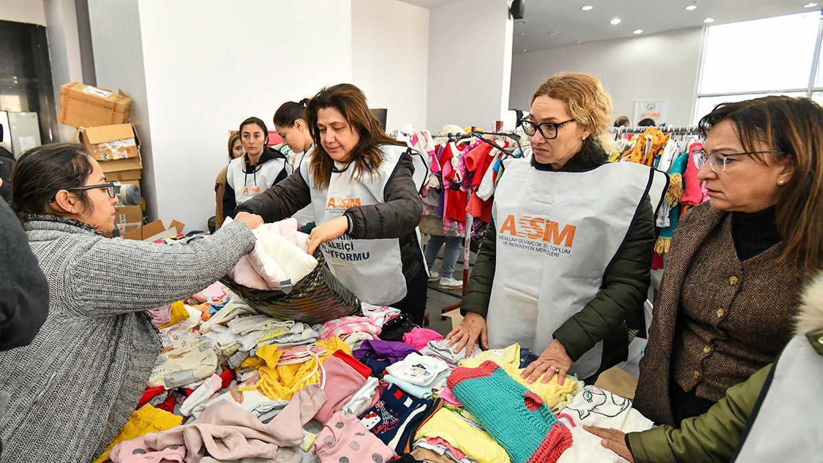 Belediye Başkanı Ümit Uysal’ın eşi Ümran Uysal da mağazada gönüllülerle çalıştı, depremzede ailelerle ilgilendi.