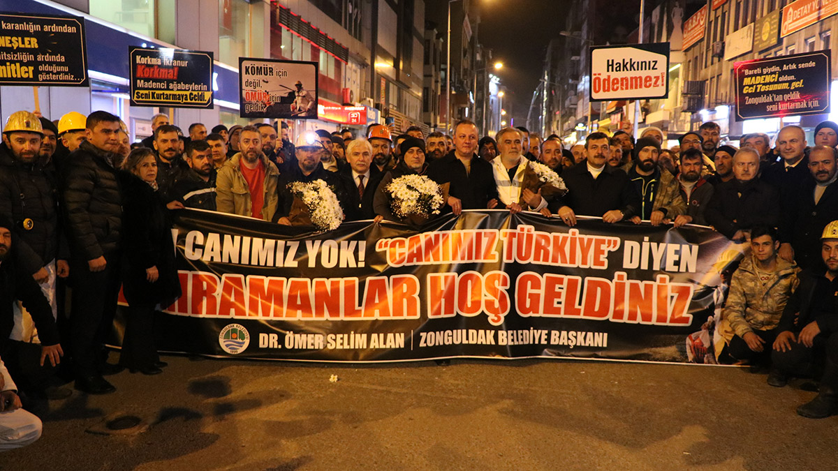 Deprem bölgelerinde görev yapan Türkiye Taşkömürü Kurumu’nda çalışan maden işçileri, kafileler halinde Zonguldak’a geliyor. Akşam saatlerinde kente gelen 200’den fazla madenci için Zonguldak Belediyesi tarafından Madenci Anıtı önünde karşılama töreni düzenlendi. Karşılamaya AK Parti Milletvekili Hamdi Uçar, Zonguldak Belediye Başkanı Ömer Selim Alan, Kozlu Belediye Başkanı Ali Bektaş ve çok sayıda vatandaş katıldı. Madenciler ‘Kömür değil, ömür için geldik, ‘Nice karanlığın ardından güneşler; ümitsizliğin ardında ümitler olduğunu gösterdiniz’ yazılı döviz ve ‘Bizim canımız yok. Bizim canımız Türkiye diyen kahramanlar hoş geldiniz’ yazan pankartla karşılandı. Karşılamada ‘Zonguldak sizinle gurur duyuyor’ sloganları atıldı.