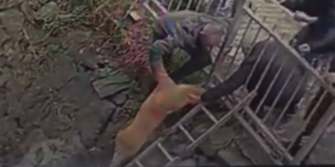 Köpeğin kurtarılma anı ve köpeğin kendisini kurtaran kişiye sevgi gösterisinde bulunması güvenlik kameralarına yansıdı.