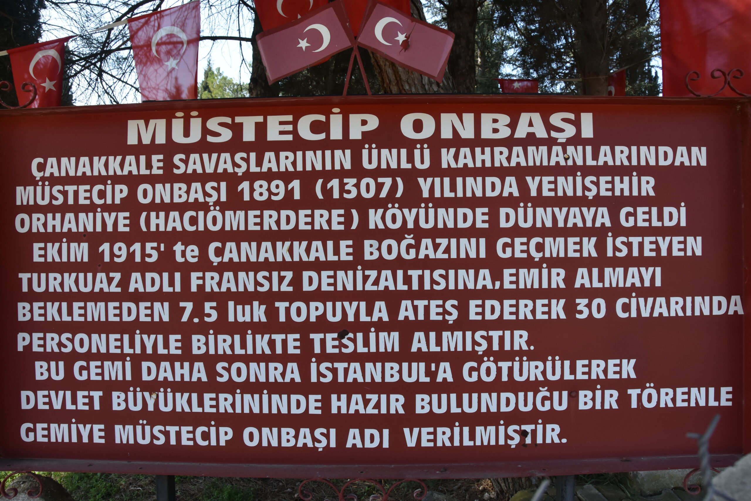 Müstecip Onbaşı’yı, 18 Mart Çanakkale Zaferi’nin 111’inci yılında Yenişehir ilçesindeki kabri başında anan tarihçi doktor Salih Erol, “Biz şu an Bursa’nın Yenişehir ilçesine bağlı Orhaniye Mahallesi’ndeyiz. Halk arasında Hacıömerdere köyü olarak geçiyor. Burası 93 Harbi sonrası kurulmuş bir muhacir köyü. Burası da köyün mezarlığı. Burada bulunmamızın özel nedeni de bu köyde büyük bir Çanakkale Gazisi’nin yaşamış olması. Şu an onun kabrinin başındayız. Bu gazimiz Müstecip Onbaşı ya da Müstecip Kılıçaslan. 1891 yılında doğmuş, 1’inci Dünya Savaşı ve Milli Mücadele’de de bulunmuş, 1959 yılına kadar yaşamış bir vatandaştır. Çanakkale Savaşı sırasında asker olarak cephede bulunmuştur. Topçu birliğinde görev yapmıştır. Onu asıl önemli kılan şey, Fransız çok meşhur olan denizaltısı Turquoise’yi periskopundan vurarak ele geçirilmesini sağlaması. Biliyorsunuz 18 Mart’ta deniz savaşıyla başladı ama Fransızlar, İngilizler, denizaltılarla boğazı defalarca geçtiler. İşte o denizaltılarından birini vuran ve teslim alınmasını sağlayan bir kahramanın mezarının başındayız” dedi.
