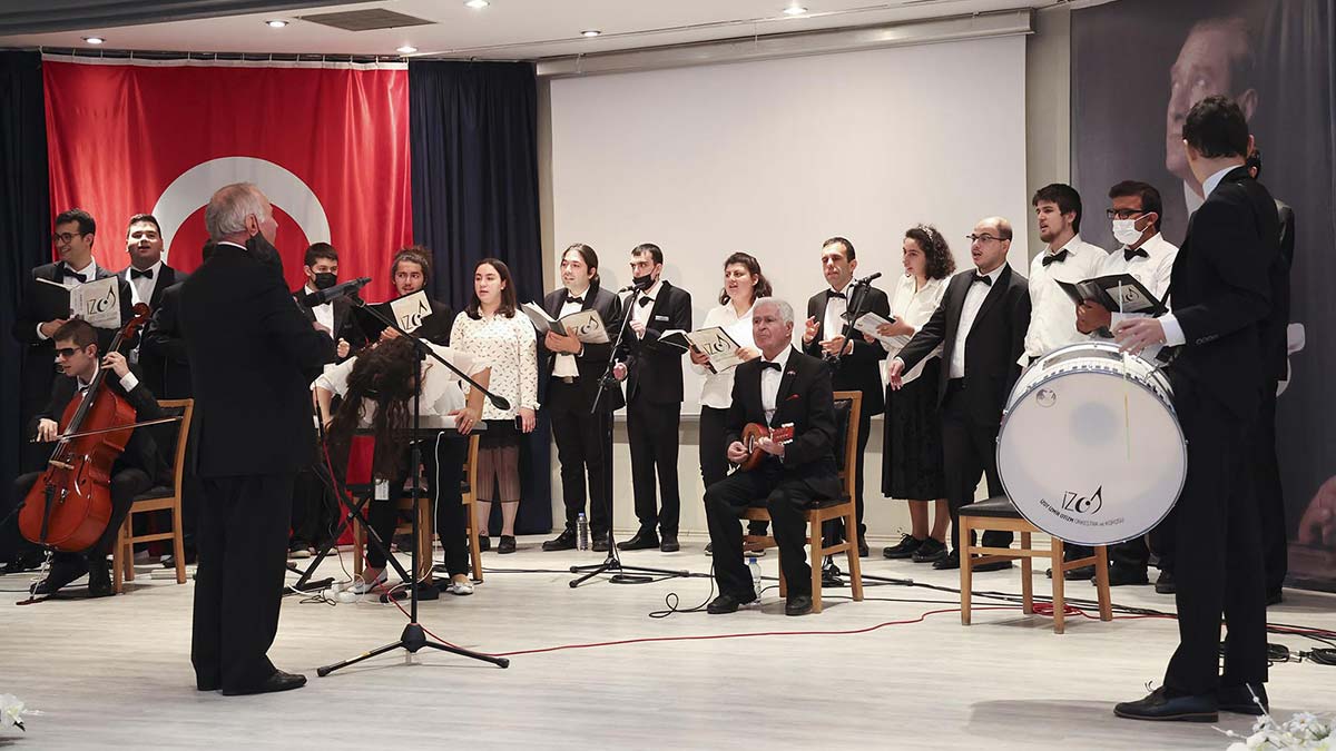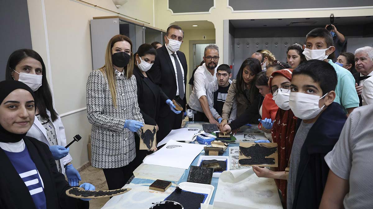 İzmir Otizm Orkestrası ve Korosu’nun müzik dinletisinin ardından özel gereksinimli öğrenciler ve aileleri, Rektör Hotar ve Buca Kaymakamı Mahmut Nedim Tuncer’in de yer aldığı ‘Kalıp Baskı ile Neşeli Torbalar’ temalı atölye çalışmasına katıldı.