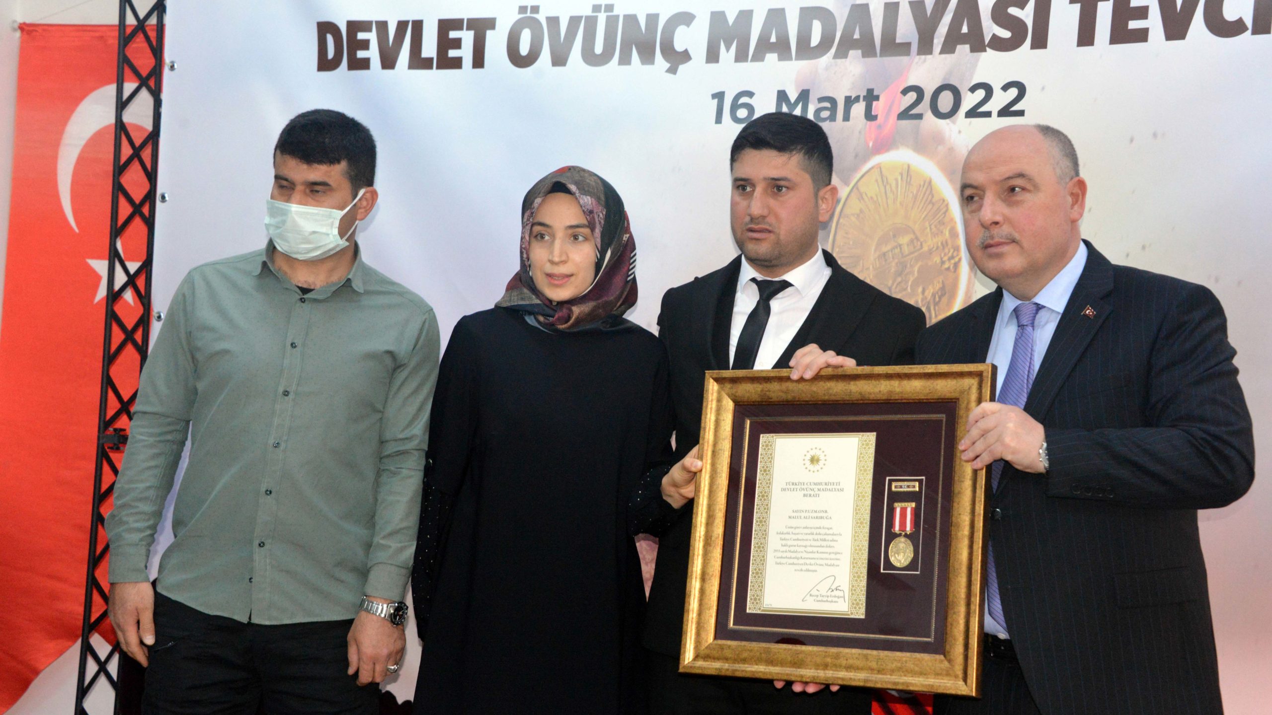 Vatan savunmasında şehit olanların ailelerine ve gazi olanlara Cumhurbaşkanı Recep Tayyip Erdoğan tarafından gönderilen Devlet Övünç Madalyası ve Beratı törenle verildi.