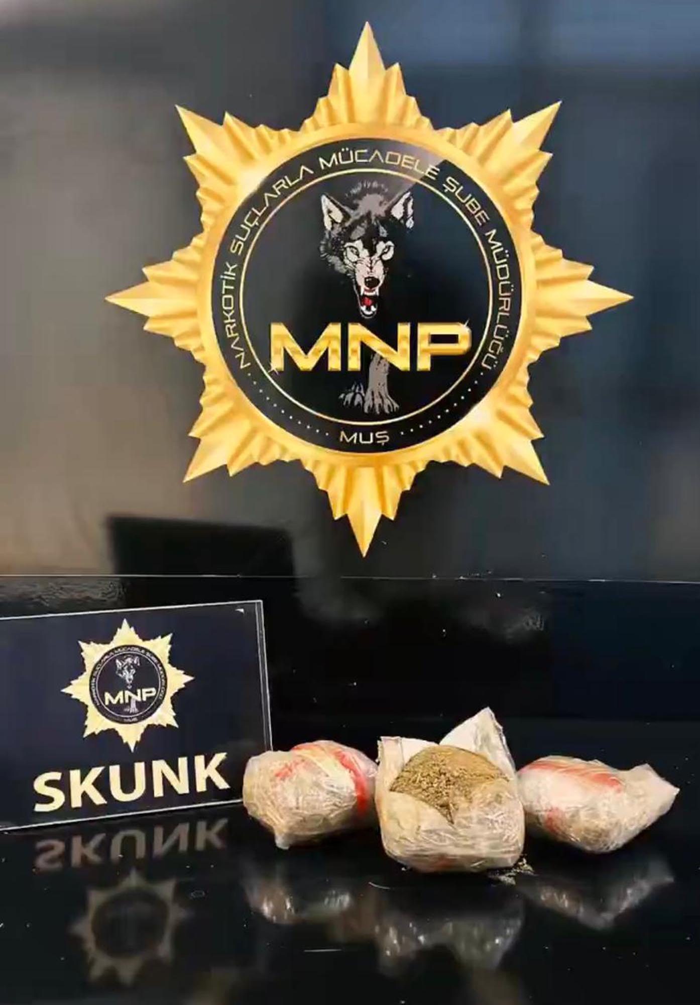 Muş İl Emniyet Müdürlüğü Narkotik Suçlarla Mücadele Şube Müdürlüğü ekipleri, uyuşturucuyla mücadele kapsamında yürüttükleri çalışmalar çerçevesinde şüphe üzerine bir aracı durdurup, arama yaptı. Narkotik köpeğinin tepki verdiği direksiyon aksamında özel olarak hazırlanmış bölmede 3 parça halinde toplam 762 gram skunk ele geçirildi. Gözaltına alınan bir kişi emniyetteki işlemlerinin ardından çıkarıldığı mahkemece tutuklanarak cezaevine gönderildi.